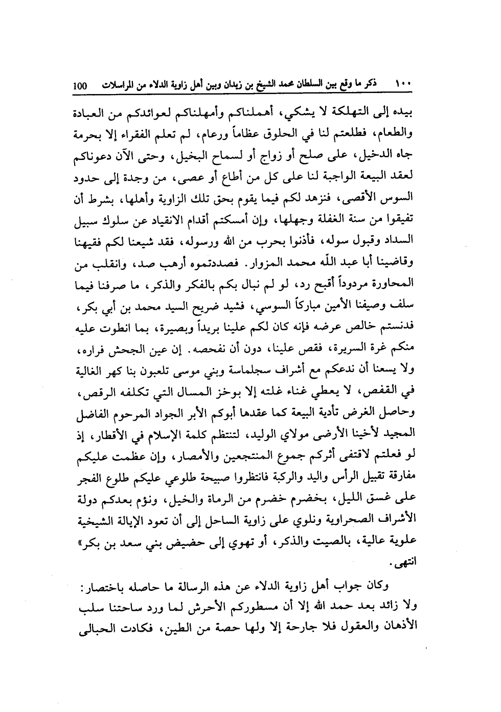 بِيَدِهِ إِلَى التَّهْلُكَة لَا يشكي أهملناكم وأمهلناكم لعوائدكم من الْعِبَادَة وَالطَّعَام فطلعتم لنا فِي الحلوق عظاما ورعام لم تعلم الْفُقَرَاء إِلَّا بِحرْمَة جاه الدخيل على صلح أَو زواج أَو لسماح الْبَخِيل وَحَتَّى الْآن دعوناكم لعقد الْبيعَة الْوَاجِبَة لنا على كل من أطَاع أَو عصى من وَجدّة إِلَى حُدُود السوس الْأَقْصَى فنزهد لكم فِيمَا يقوم بِحَق تِلْكَ الزاوية وَأَهْلهَا بِشَرْط أَن تفيقوا من سنة الْغَفْلَة وجهلها وَإِن أَمْسَكْتُم أَقْدَام الانقياد عَن سلوك سَبِيل السداد وَقبُول سوله فأذنوا بِحَرب من الله وَرَسُوله فقد شيعنا لكم فقيهنا وقاضينا أَبَا عبد الله مُحَمَّد المزوار فصددتموه أرهب صد وانقلب من المحاورة مردودا أقبح رد لَو لم نبال بكم بالفكر وَالذكر مَا صرفنَا فِيمَا سلف وصيفنا الْأمين مُبَارَكًا السُّوسِي فشيد ضريح السَّيِّد مُحَمَّد بن أبي بكر فدنستم خَالص عرضه فَإِنَّهُ كَانَ لكم علينا بريدا وبصيرة بِمَا انطوت عَلَيْهِ مِنْكُم غرَّة السريرة فَقص علينا دون أَن نفحصه إِن عين الجحش فراره وَلَا يسعنا أَن تدعكم مَعَ أَشْرَاف سجلماسة وَبني مُوسَى تلعبون بِنَا كهر الغالية فِي القفص لَا يُعْطي غناء غَلَّته إِلَّا بوخز المسال الَّتِي تكلفه الرقص وَحَاصِل الْغَرَض تأدية الْبيعَة كَمَا عقدهَا أبوكم الأبر الْجواد المرحوم الْفَاضِل الْمجِيد لأخينا الأرضى مولَايَ الْوَلِيد لتنتظم كلمة الْإِسْلَام فِي الأقطار إِذْ لَو فَعلْتُمْ لاقتفى أثركم جموع المنتجعين والأمصار وَإِن عظمت عَلَيْكُم مُفَارقَة تَقْبِيل الرَّأْس وَالْيَد وَالركبَة فانتظروا صَبِيحَة طلوعي عَلَيْكُم طُلُوع الْفجْر على غسق اللَّيْل بخضرم خضرم من الرُّمَاة وَالْخَيْل ونؤم بعدكم دولة الْأَشْرَاف الصحراوية ونلوي على زَاوِيَة السَّاحِل إِلَى أَن تعود الإيالة الشيخية علوِيَّة عالية بالصيت وَالذكر أَو تهوي إِلَى حضيض بني سعد بن بكر انْتهى