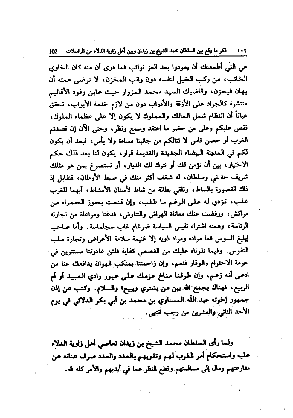 هِيَ الَّتِي أطمعتك أَن يعودوا بعد الْعِزّ نَوَائِب فَمَا درى أَن مِنْهُ كَانَ الخاوي الخائب من ركب الْخَيل لنَفسِهِ دون راتب المخزن لَا ترْضى همته أَن يهان فيحزن وقاضيك السَّيِّد مُحَمَّد المزوار حَيْثُ عاين وُفُود الأقاليم منتشرة كالجراد على الْأَزِقَّة والأدراب دون من لَازم خدمَة الْأَبْوَاب تحقق عيَانًا أَن انتظام شَمل الْمَالِك والمملوك لَا يكون إِلَّا على عُظَمَاء الْمُلُوك فَقص عَلَيْكُم وعَلى من حضر مَا اعْتقد وَسمع وَنظر وَحَتَّى الْآن إِن قصدتم الغرب أَو حصن فاس لَا تنالكم من جانبنا مساءة وَلَا بَأْس فَبعد أَن يكون لكم فِي الْمَدِينَة الْبَيْضَاء الجديدة والقديمة قَرَار يكون لنا بعد ذَلِك حكم الِاخْتِيَار بَين أَن نؤمن لَك أَو نَتْرُك لَك الديار أَو نستصرخ بِمن هُوَ مثلك شرِيف حَقِيقِيّ وسلطان لَهُ شغف أَكثر مِنْك فِي ضبط الأوطان فنقابل إِذْ ذَاك القصورة بالساط ونلقي بطانة من شاط لأسنان الأمشاط أَيهمَا للغرب غلب نُؤَدِّي لَهُ على الرغم مَا طلب وَإِن قنعت بحوز الْحَمْرَاء من مراش ورفضت عَنْك معاناة الهراش والتناوش فَدَعْنَا ومراعاة من تِجَارَته الرِّئَاسَة وهمته اشْتِرَاء نَفِيس السياسة ضرغام غَابَ سجلماسة وَأما صَاحب إيليغ السوس فَمَا مُرَاده وَمُرَاد ذويه إِلَّا غنيمَة سَلامَة الْأَعْرَاض وتجارة سلب النُّفُوس وَفِيمَا تلوناه عَلَيْك من الْقَصَص كِفَايَة فلئن غادرتنا مستترين فِي حُرْمَة الاحترام وَالْوَقار فَنعم وَإِن زاحمتنا بمنكب الهوان يدافعك عَنَّا من ادّعى أَنه زعم وَإِن طرقنا مناخ عزمك على عبور وَادي العبيد أَو أم الرّبيع فهناك يجمع الله بَين من يَشْتَرِي وَيبِيع وَالسَّلَام وَكتب عَن إِذن جُمْهُور إخْوَته عبد الله المسناوي بن مُحَمَّد بن أبي بكر الدلائي فِي يَوْم الْأَحَد الثَّانِي وَالْعِشْرين من رَجَب انْتهى