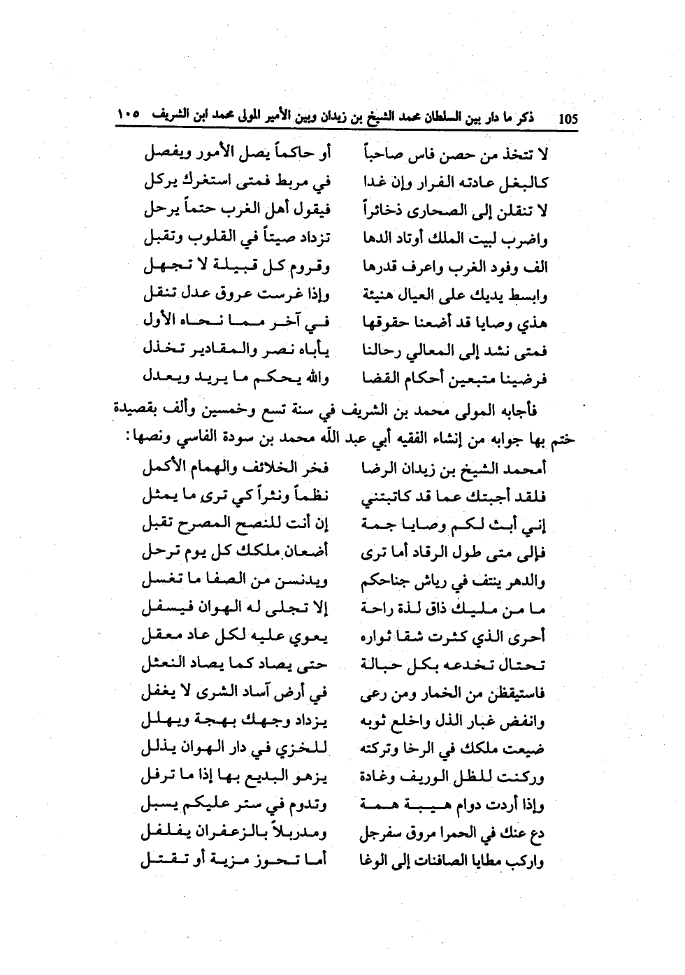 فَأَجَابَهُ الْمولى مُحَمَّد بن الشريف فِي سنة تسع وَخمسين وَألف بقصيدة ختم بهَا جَوَابه من إنْشَاء الْفَقِيه أبي عبد الله مُحَمَّد بن سَوْدَة الفاسي وَنَصهَا