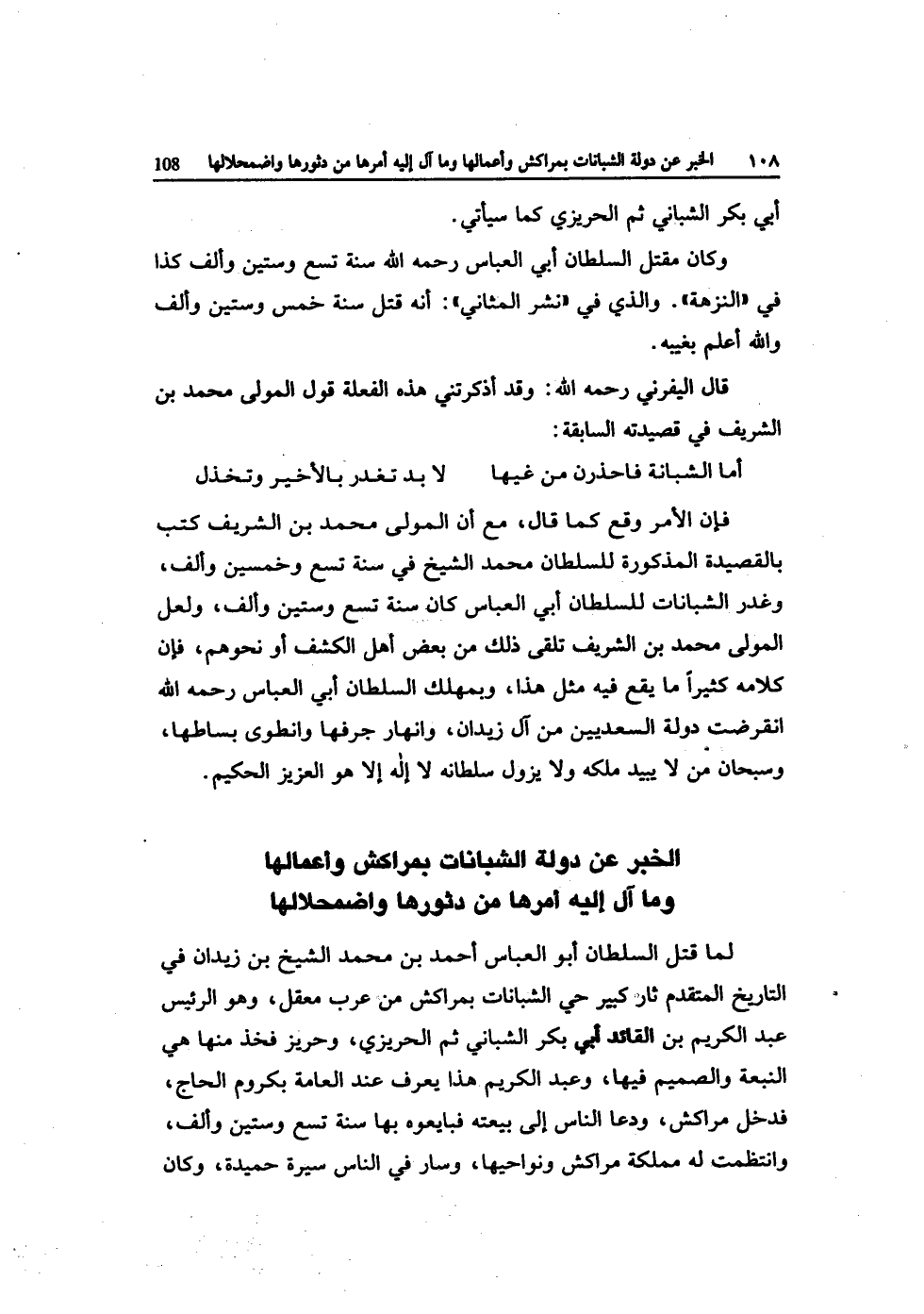 فَإِن الْأَمر وَقع كَمَا قَالَ مَعَ أَن الْمولى مُحَمَّد بن الشريف كتب بالقصيدة الْمَذْكُورَة للسُّلْطَان مُحَمَّد الشَّيْخ فِي سنة تسع وَخمسين وَألف وغدر الشبانات للسُّلْطَان أبي الْعَبَّاس كَانَ سنة تسع وَسِتِّينَ وَألف وَلَعَلَّ الْمولى مُحَمَّد بن الشريف تلقى ذَلِك من بعض أهل الْكَشْف أَو نحوهم فَإِن كَلَامه كثيرا مَا يَقع فِيهِ مثل هَذَا وبمهلك السُّلْطَان أبي الْعَبَّاس رَحمَه الله انقرضت دولة السعديين من آل زَيْدَانَ وانهار جرفها وانطوى بساطها وَسُبْحَان من لَا يبيد ملكه وَلَا يَزُول سُلْطَانه لَا إِلَه إِلَّا هُوَ الْعَزِيز الْحَكِيم