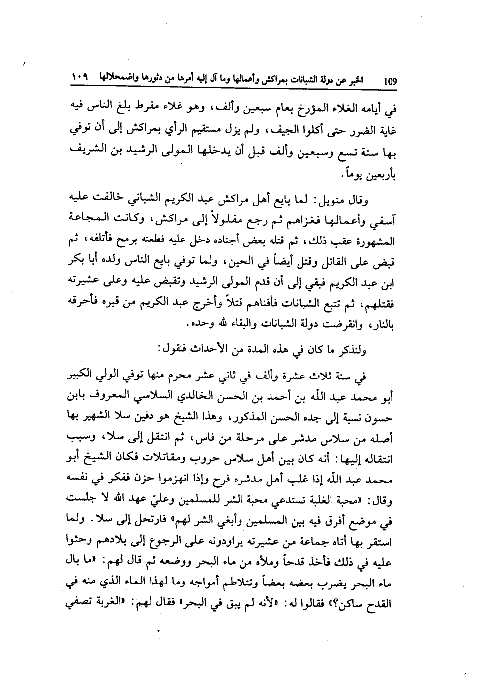 وَقَالَ منويل لما بَايع أهل مراكش عبد الْكَرِيم الشباني خَالَفت عَلَيْهِ آسفي وأعمالها فغزاهم ثمَّ رَجَعَ مفلولا إِلَى مراكش وَكَانَت المجاعة الْمَشْهُورَة عقب ذَلِك ثمَّ قَتله بعض أجناده دخل عَلَيْهِ فطعنه بِرُمْح فأتلفه ثمَّ قبض على الْقَاتِل وَقتل أَيْضا فِي الْحِين وَلما توفّي بَايع النَّاس وَلَده أَبَا بكر ابْن عبد الْكَرِيم فَبَقيَ إِلَى أَن قدم الْمولى الرشيد وتقبض عَلَيْهِ وعَلى عشيرته فَقَتلهُمْ ثمَّ تتبع الشبانات فأفناهم قتلا وَأخرج عبد الْكَرِيم من قَبره فأحرقه بالنَّار وانقرضت دولة الشبانات والبقاء لله وَحده
