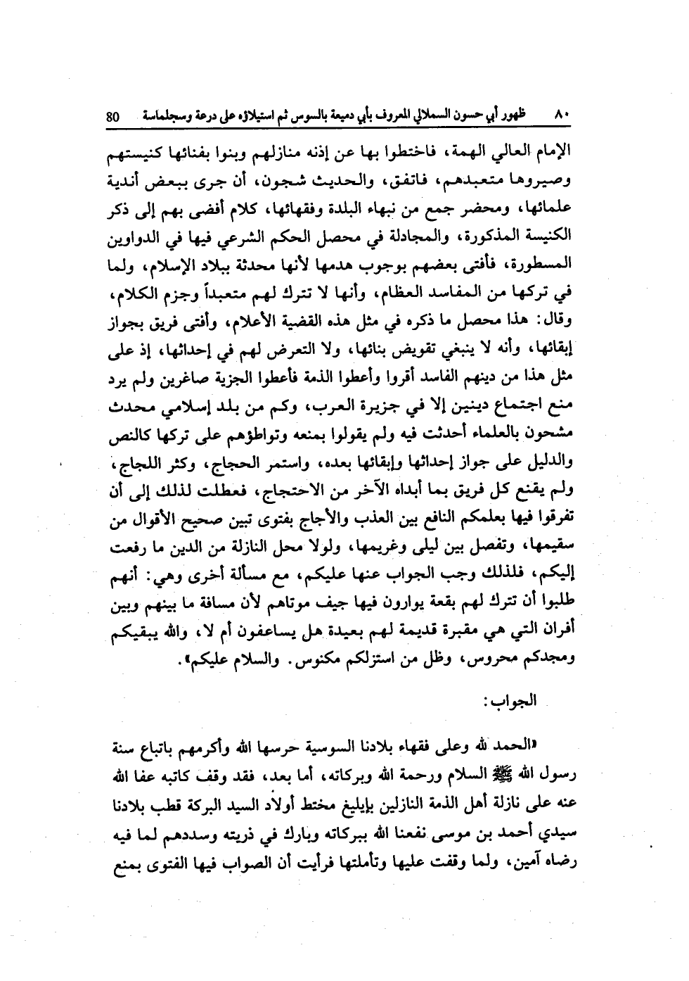 الْحَمد لله وعَلى فُقَهَاء بِلَادنَا السوسية حرسها الله وَأكْرمهمْ بِاتِّبَاع سنة رَسُول الله صلى الله عَلَيْهِ وَسلم السَّلَام وَرَحْمَة الله وَبَرَكَاته أما بعد فقد وقف كَاتبه عَفا الله عَنهُ على نازلة أهل الذِّمَّة النازلين بإيليغ مختط أَوْلَاد السَّيِّد الْبركَة قطب بِلَادنَا سَيِّدي أَحْمد بن مُوسَى نفعنا الله ببركاته وَبَارك فِي ذُريَّته وسددهم لما فِيهِ رِضَاهُ آمين وَلما وقفت عَلَيْهَا وتأملتها فَرَأَيْت أَن الصَّوَاب فِيهَا الْفَتْوَى بِمَنْع
