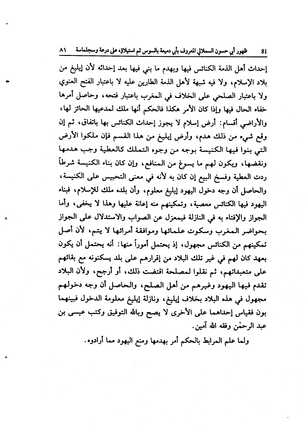 إِحْدَاث أهل الذِّمَّة الْكَنَائِس فِيهَا وبهدم مَا بنى فِيهَا بعد إحداثه لِأَن إيليغ من بِلَاد الْإِسْلَام وَلَا فِيهِ شُبْهَة لأهل الذِّمَّة الطارين عَلَيْهِ لَا بِاعْتِبَار الْفَتْح العنوي وَلَا بِاعْتِبَار الصلحي على الْخلاف فِي الْمغرب بِاعْتِبَار فَتحه وَحَاصِل أمرهَا خَفَاء الْحَال فِيهَا وَإِذا كَانَ الْأَمر هَكَذَا فَالْحكم أَنَّهَا ملك لمدعيها الْحَائِز لَهَا والأراضي أَقسَام أَرض إِسْلَام لَا يجوز إِحْدَاث الْكَنَائِس بهَا بِاتِّفَاق ثمَّ إِن وَقع شَيْء من ذَلِك هدم وَأَرْض إيليغ من هَذَا الْقسم فَإِن ملكوا الأَرْض الَّتِي بنوا فِيهَا الْكَنِيسَة بِوَجْه من وُجُوه التَّمَلُّك كالعطية وَجب هدمها ونقضها وَيكون لَهُم مَا يسوغ من الْمَنَافِع وَإِن كَانَ بِنَاء الْكَنِيسَة شرطا ردَّتْ الْعَطِيَّة وَفسخ البيع إِن كَانَ بِهِ لِأَنَّهُ فِي معنى التحبيس على الْكَنِيسَة وَالْحَاصِل أَن وَجه دُخُول الْيَهُود إيليغ مَعْلُوم وَأَن بَلَده ملك لِلْإِسْلَامِ فبناء الْيَهُود فِيهَا الْكَنَائِس مَعْصِيّة وتمكينهم مِنْهُ إِعَانَة عَلَيْهَا وَهَذَا لَا يخفى وَأما الْجَوَاز والإفتاء بِهِ فِي النَّازِلَة فبمعزل عَن الصَّوَاب وَالِاسْتِدْلَال على الْجَوَاز بحواضر الْمغرب وسكوت علمائها وموافقة أمرائها لَا يتم لِأَن أصل تمكينهم من الْكَنَائِس مَجْهُول إِذْ يحْتَمل أمورا مِنْهَا أَنه يحْتَمل أَن يكون بِعَهْد كَانَ لَهُم فِي غير تِلْكَ الْبِلَاد من إقرارهم على بلد يسكنونه مَعَ بقائهم على متعبداتهم ثمَّ نقلوا لمصْلحَة اقْتَضَت ذَلِك أَو أرجح وَلِأَن الْبِلَاد تقدم فِيهَا الْيَهُود وَغَيرهم من أهل الصُّلْح وَالْحَاصِل أَن وَجه دُخُولهمْ مَجْهُول فِي هَذِه الْبِلَاد بِخِلَاف إيليغ ونازلة إيليغ مَعْلُومَة الدُّخُول فبينهما بون فَقِيَاس إِحْدَاهمَا على الْأُخْرَى لَا يَصح وَبِاللَّهِ التَّوْفِيق وَكتب عِيسَى بن عبد الرَّحْمَن وَفقه الله آمين