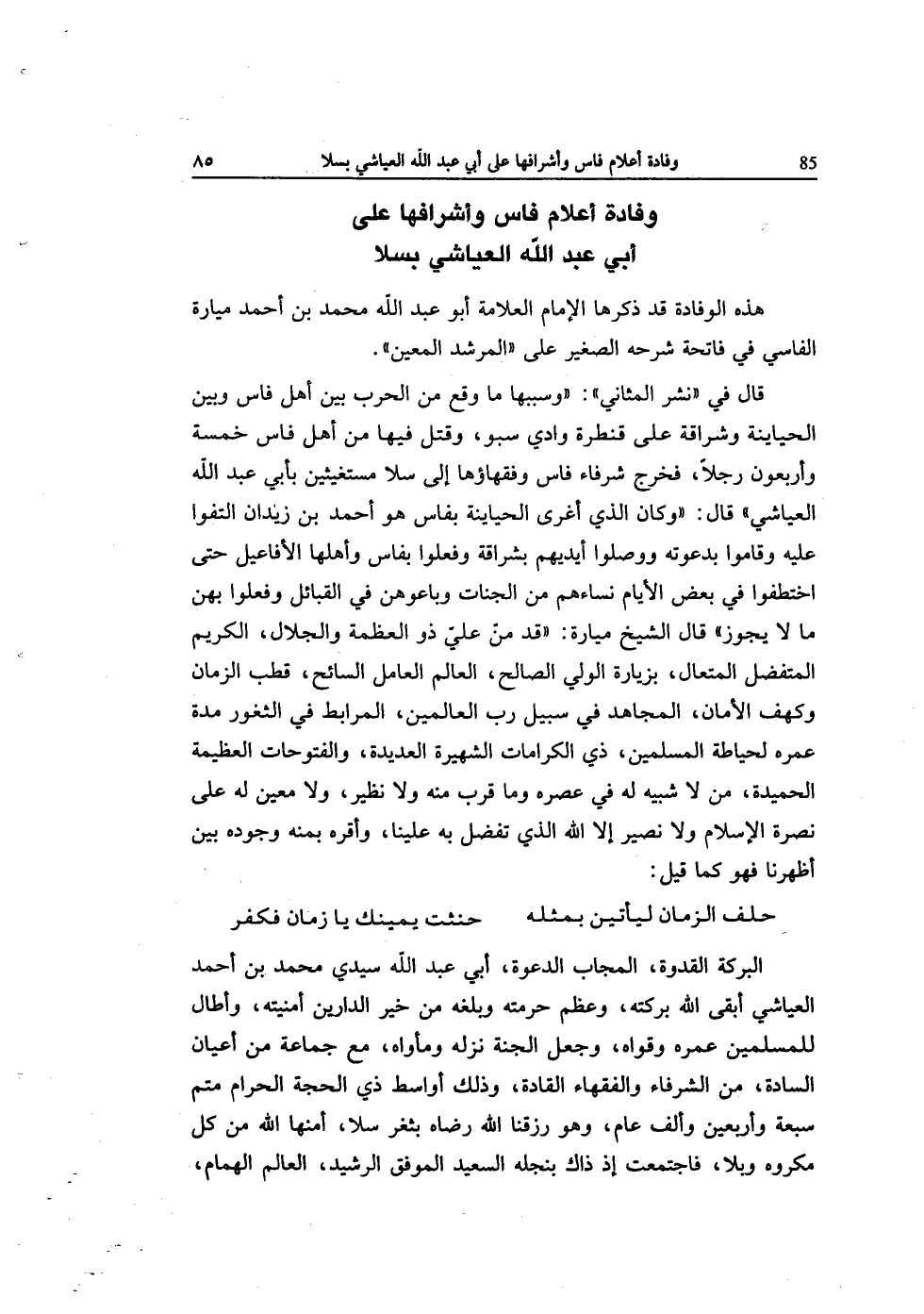 الْبركَة الْقدْوَة المجاب الدعْوَة أبي عبد الله سَيِّدي مُحَمَّد بن أَحْمد العياشي أبقى الله بركته وَعظم حرمته وبلغه من خير الدَّاريْنِ أمْنِيته وَأطَال للْمُسلمين عمره وَقواهُ وَجعل الْجنَّة نزله ومأواه مَعَ جمَاعَة من أَعْيَان السَّادة من الشرفاء وَالْفُقَهَاء القادة وَذَلِكَ أواسط ذِي الْحجَّة الْحَرَام متم سَبْعَة وَأَرْبَعين وَألف عَام وَهُوَ رزقنا الله رِضَاهُ بثغر سلا أمنها الله من كل مَكْرُوه وَبلا فاجتمعت إِذْ ذَاك بنجله السعيد الْمُوفق الرشيد الْعَالم الْهمام
