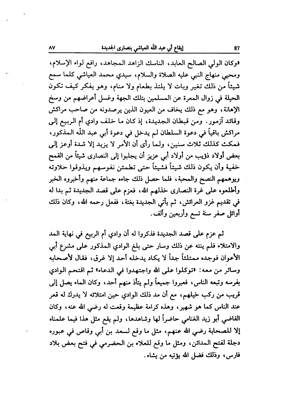 ثمَّ عزم على قصد الجديدة فَذكرُوا لَهُ أَن وَادي أم الرّبيع فِي نِهَايَة الْمَدّ والامتلاء فَلم ينْتَه عَن ذَلِك وَسَار حَتَّى بلغ الْوَادي الْمَذْكُور على مشرع أبي الأعوان فَوَجَدَهُ ممتلئا جدا لَا يكَاد يدْخلهُ أحد إِلَّا غرق فَقَالَ لأَصْحَابه وَسَائِر من مَعَه توكلوا على الله واجتهدوا فِي الدُّعَاء ثمَّ اقتحم الْوَادي بفرسه وَتَبعهُ النَّاس فعبروا جَمِيعًا وَلم يتأذ مِنْهُم أحد وَكَانَ المَاء يصل إِلَى قريب من ركب خيلهم مَعَ أَن مد ذَلِك الْوَادي حِين امتلائه لَا يدْرك لَهُ قَعْر عِنْد النَّاس كَمَا هُوَ شهير وَهَذِه كَرَامَة عَظِيمَة وَقعت لَهُ رَضِي الله عَنهُ وَكَانَ القَاضِي أَبُو زيد الغنامي حَاضرا لَهَا وشاهدها وَلم يَقع مثل هَذَا فِيمَا علمناه إِلَّا للصحابة رَضِي الله عَنْهُم مثل مَا وَقع لسعد بن أبي وَقاص فِي عبوره دجلة لفتح الْمَدَائِن وَمثل مَا وَقع للعلاء بن الْحَضْرَمِيّ فِي فتح بعض بِلَاد فَارس وَذَلِكَ فضل الله يؤتيه من يَشَاء