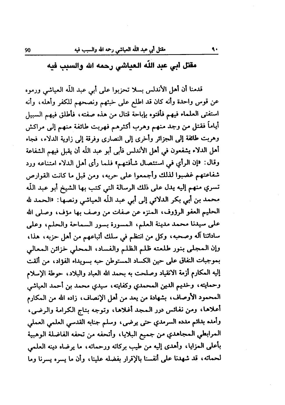 قدمنَا أَن أهل الأندلس بسلا تحزبوا على أبي عبد الله العياشي ورموه عَن قَوس وَاحِدَة وَأَنه كَانَ قد اطلع على خبثهمْ ونصحهم للكفر وَأَهله وَأَنه استفتى الْعلمَاء فيهم فأفتوه بِإِبَاحَة قتال من هَذِه صفته فَأطلق فيهم السَّبِيل أَيَّامًا فَقتل من وجد مِنْهُم وهرب أَكْثَرهم فهربت طَائِفَة مِنْهُم إِلَى مراكش وهربت طَائِفَة إِلَى الجزائر وَأُخْرَى إِلَى النَّصَارَى وَفرْقَة إِلَى زَاوِيَة الدلاء فجَاء أهل الدلاء يشفعون فِي أهل الأندلس فَأبى أَبُو عبد الله أَن يقبل فيهم الشَّفَاعَة وَقَالَ إِن الرَّأْي فِي استئصال شأفتهم فَلَمَّا رأى أهل الدلاء امْتِنَاعه ورد شفاعتهم غضبوا لذَلِك وَأَجْمعُوا على حربه وَمن قبل مَا كَانَت القوارص تسري مِنْهُم إِلَيْهِ يدل على ذَلِك الرسَالَة الَّتِي كتب بهَا الشَّيْخ أَبُو عبد الله مُحَمَّد بن أبي بكر الدلائي إِلَى أبي عبد الله العياشي وَنَصهَا الْحَمد لله الْحَلِيم الْعَفو الرؤوف المنزه عَن صِفَات من وصف بهَا مؤف وَصلى الله عَلَيْهِ وَسلم مَدِينَة الْعلم المسورة بسور السماحة والحلم وعَلى سَادَاتنَا آله وَصَحبه وكل من انتظم فِي سلك أتباعهم من أهل حزبه هَذَا وَإِن المجلى بِنور طلعته ظلم الظُّلم وَالْفساد الْمحلي خَزَائِن الْمَعَالِي بموجبات النِّفَاق على حِين الكساد المستوطن حبه بسويداء الْفُؤَاد من أَلْقَت إِلَيْهِ المكارم أزمة الانقياد وصلحت بِهِ بِحَمْد الله الْعباد والبلاد حوطة الْإِسْلَام وحمايته وخديم الدّين المحمدي وكفايته سَيِّدي مُحَمَّد بن أَحْمد العياشي الْمَحْمُود الْأَوْصَاف بِشَهَادَة من يعد من أهل الْإِنْصَاف زَاده الله من المكارم أَعْلَاهَا وَمن نفائس دُرَر الْمجد أغلاها وَتوجه بتاج الْكَرَامَة والرضى وأمده بدائم مدده السرمدي حَتَّى يرضى وَسلم جنابه الْقُدسِي العلمي العملي المرابطي المجاهدي من جَمِيع البلايا وأتحفه من تحفه الفاضلة الوهبية بِأَعْلَى المزايا وَأهْدى إِلَيْهِ من طيب بركاته ورحماته مَا يرضاه دينه العلمي لحماته قد شَهِدنَا على أَنْفُسنَا بِالْإِقْرَارِ بفضله علينا وَأَن مَا يسره يسرنَا وَمَا