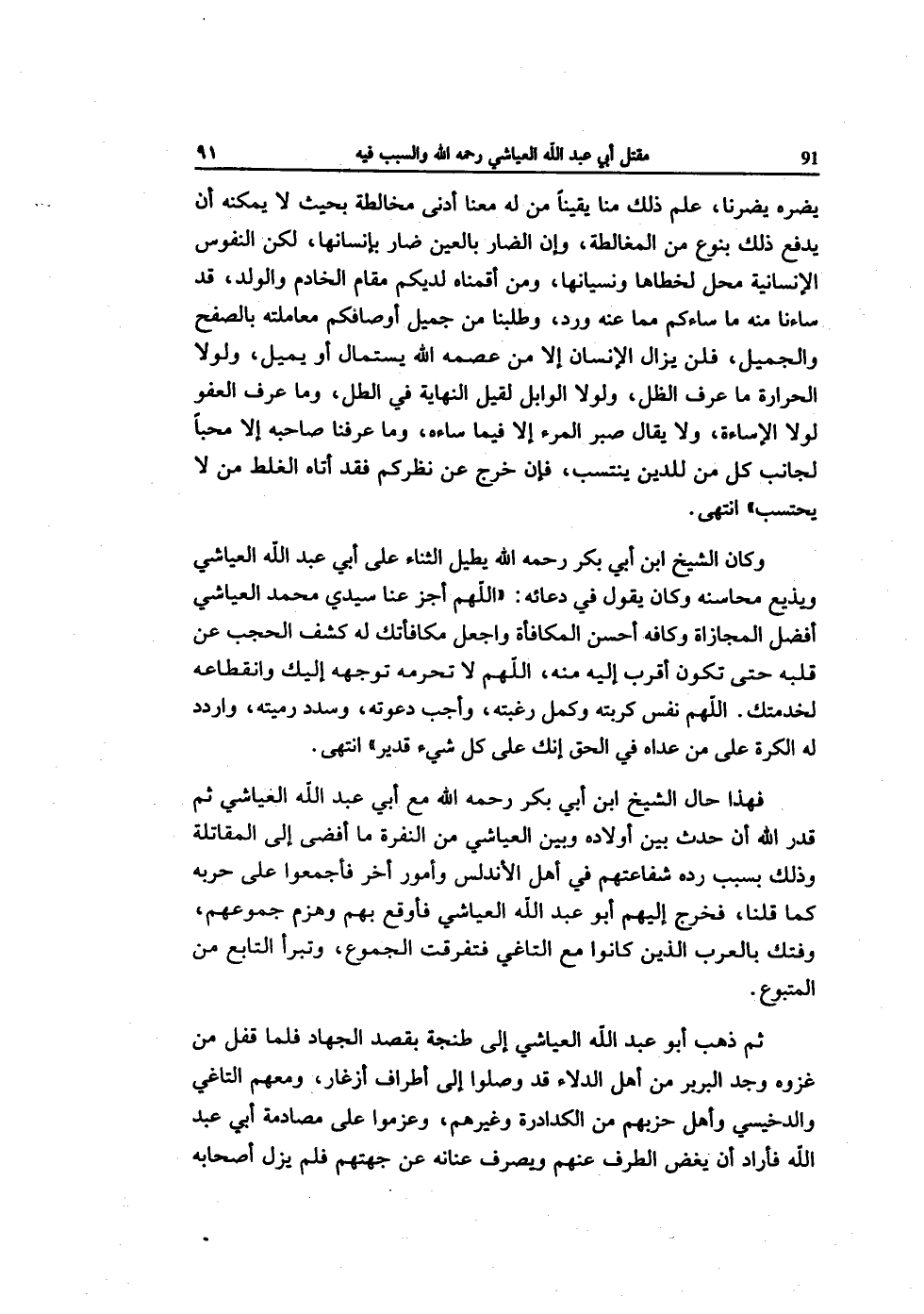 فَهَذَا حَال الشَّيْخ ابْن أبي بكر رَحمَه الله مَعَ أبي عبد الله العياشي ثمَّ قدر الله أَن حدث بَين أَوْلَاده وَبَين العياشي من النفرة مَا أفْضى إِلَى الْمُقَاتلَة وَذَلِكَ بِسَبَب رده شفاعتهم فِي أهل الأندلس وَأُمُور أخر فَأَجْمعُوا على حربه كَمَا قُلْنَا فَخرج إِلَيْهِم أَبُو عبد الله العياشي فأوقع بهم وَهزمَ جموعهم وفتك بالعرب الَّذين كَانُوا مَعَ التاغي فتفرقت الجموع وتبرأ التَّابِع من الْمَتْبُوع