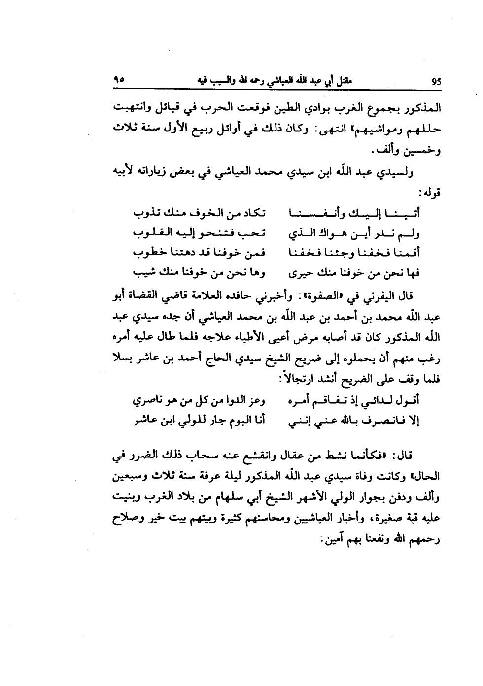 قَالَ فَكَأَنَّمَا نشط من عقال وانقشع عَنهُ سَحَاب ذَلِك الضَّرَر فِي الْحَال وَكَانَت وَفَاة سَيِّدي عبد الله الْمَذْكُور لَيْلَة عَرَفَة سنة ثَلَاث وَسبعين وَألف وَدفن بجوار الْوَلِيّ الْأَشْهر الشَّيْخ أبي سلهام من بِلَاد الغرب وبنيت عَلَيْهِ قبَّة صَغِيرَة وأخبار العياشيين ومحاسنهم كَثِيرَة وبيتهم بَيت خير وَصَلَاح رَحِمهم الله ونفعنا بهم آمين