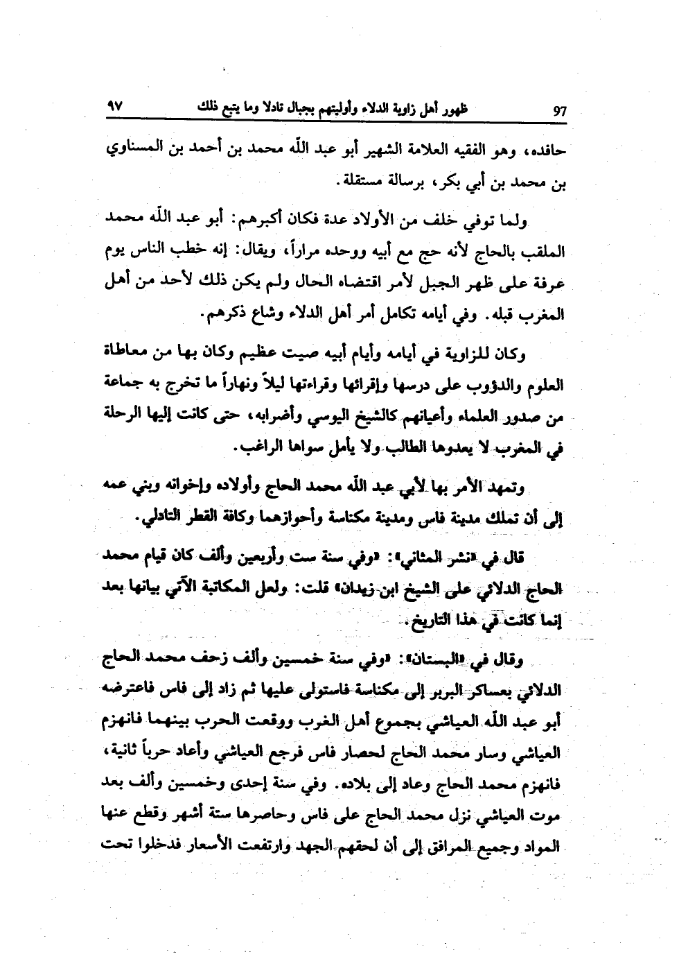 وَقَالَ فِي الْبُسْتَان وَفِي سنة خمسين وَألف زحف مُحَمَّد الْحَاج الدلائي بعساكر البربر إِلَى مكناسة فاستولى عَلَيْهَا ثمَّ زَاد إِلَى فاس فاعترضه أَبُو عبد الله العياشي بجموع أهل الغرب وَوَقعت الْحَرْب بَينهمَا فَانْهَزَمَ العياشي وَسَار مُحَمَّد الْحَاج لحصار فاس فَرجع العياشي وَأعَاد حَربًا ثَانِيَة فَانْهَزَمَ مُحَمَّد الْحَاج وَعَاد إِلَى بِلَاده وَفِي سنة إِحْدَى وَخمسين وَألف بعد موت العياشي نزل مُحَمَّد الْحَاج على فاس وحاصرها سِتَّة أشهر وَقطع عَنْهَا الْموَاد وَجَمِيع الْمرَافِق إِلَى أَن لحقهم الْجهد وَارْتَفَعت الأسعار فَدَخَلُوا تَحت