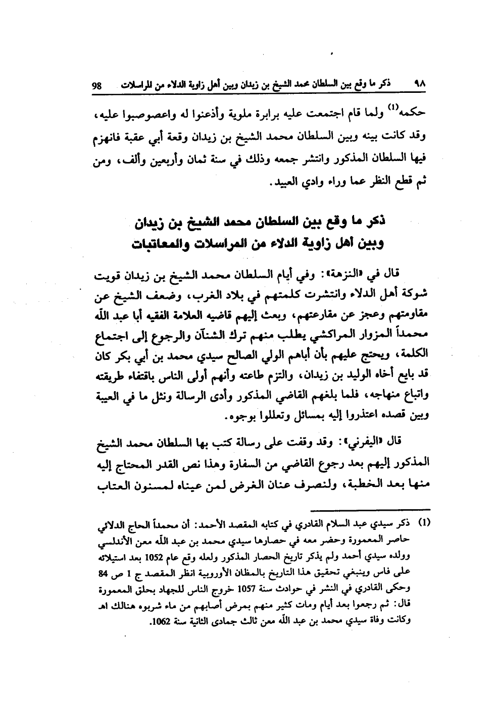 قَالَ فِي النزهة وَفِي أَيَّام السُّلْطَان مُحَمَّد الشَّيْخ بن زَيْدَانَ قويت شَوْكَة أهل الدلاء وانتشرت كلمتهم فِي بِلَاد الغرب وَضعف الشَّيْخ عَن مقاومتهم وَعجز عَن مقارعتهم وَبعث إِلَيْهِم قاضيه الْعَلامَة الْفَقِيه أَبَا عبد الله مُحَمَّد المزوار المراكشي يطْلب مِنْهُم ترك الشنآن وَالرُّجُوع إِلَى اجْتِمَاع الْكَلِمَة ويحتج عَلَيْهِم بِأَن أباهم الْوَلِيّ الصَّالح سَيِّدي مُحَمَّد بن أبي بكر كَانَ قد بَايع أَخَاهُ الْوَلِيد بن زَيْدَانَ وَالْتزم طَاعَته وَأَنَّهُمْ أولى النَّاس باقتفاء طَرِيقَته وَاتِّبَاع منهاجه فَلَمَّا بَلغهُمْ القَاضِي الْمَذْكُور وَأدّى الرسَالَة ونثل مَا فِي العيبة وَبَين قَصده اعتذروا إِلَيْهِ بمسائل وتعللوا بِوُجُوه