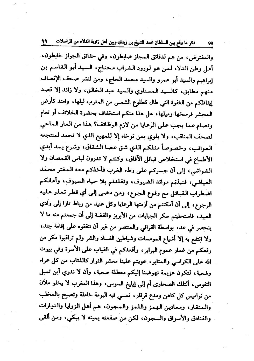 والمفترض من هم لدقائق الْمجَاز ضابطون وَفِي حقائق الْجَوَاز خابطون أهل وَطن الدلاء لمن هُوَ لوُرُود الشَّرَاب مُحْتَاج السَّيِّد أَبُو الْقَاسِم بن إِبْرَاهِيم وَالسَّيِّد أَبُو عَمْرو وَالسَّيِّد مُحَمَّد الْحَاج وَمن لنشر صحف الْإِنْصَاف مِنْهُم مُطَابق كالسيد المسناوي وَالسَّيِّد عبد الْخَالِق وَلَا زَائِد إِلَّا قصد إيقاظكم من الغفوة الَّتِي طَال كطلوع الشَّمْس من الْمغرب لَيْلهَا وامتد كأرض الْمَحْشَر فرسخها وميلها هَل هَذَا مِنْكُم استخفاف بِحَضْرَة الخلائف أَو تعام وتصام عَمَّا يجب على الرعايا من لَازم الْوَظَائِف هَذَا من الْعَار الماحي لصحف المناقب وَلَا يلوي بِمن توخاه إِلَّا للمهيع الَّذِي لَا تحمد لمنتجعه العواقب وخصوصا مثلكُمْ الَّذِي شقّ عَصا الشقاق وَشرع يمد أَيدي الأطماع فِي استخلاص قبائل الْآفَاق وكنتم لَا تَدْرُونَ لِبَاس القمصان وَلَا الشواشي إِلَى أَن جسركم على وَطْء الغرب فأخذكم مَعَه المعتر مُحَمَّد العياشي فنبذتم مَوَائِد الضيوف وتقلدتم بِلَا حَيَاء السيوف وأعانكم اضْطِرَاب الْقَبَائِل مَعَ وُقُوع الْجُوع وَمن مضى إِلَى أَي قطر تعذر عَلَيْهِ الرُّجُوع إِلَى أَن أمكنتم من أزمتها الرعايا وكل عنيد من رِبَاط تازا إِلَى وَادي العبيد فاستحليتم سكر الجبايات من الأبريز وَالْفِضَّة إِلَى أَن جمعتم مِنْهُ مَا لَا ينْحَصر فِي عد بِوَاسِطَة الْقَرَافِيّ والمنتصر من غير أَن تنفقوه على إِقَامَة جند وَلَا انْتفع بِهِ إِلَّا أشياع المومسات وشياطين الْفساد وَالشَّر وَلم ترقبوا مكر من رفعكم من غمار عُمُوم البرابر وأقعدكم فِي القباب على الأسرة وَفِي بيُوت الله على الكراسي والمنابر عويتم علينا معشر الثوار كالذئاب من كل عراء وَشعْبَة لتَكون عَزِيمَة نهوضنا إِلَيْكُم معطلة صعبة وَأَن لَا نَدْرِي أَيْن تميل النُّفُوس ألتلك الصحارى أم إِلَى إيليغ السوس وَهَذَا الْمغرب لَا يَخْلُو ملآن من نواميس كل كَاهِن ومدع قرقار تمسي فِيهِ البومة خاملة وتصبح بالمخلب والمنقار ومعادين الْهَمْز واللمز والمجون هم أهل الزوايا والديارات والفنادق والأسواق والسجون لَكِن من صفعته يَمِينه لَا يبكي وَمن ألْقى