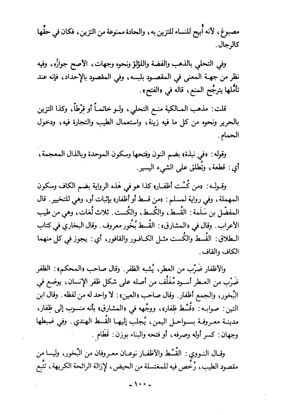 وقال النووي: القُسْط والأظفار نوعان معروفان من البُخور، وليسا من مقصود الطيب، رُخِّص فيه للمغتسلة من الحيض، لإزالة الرائحة الكريهة، تتَّبِع