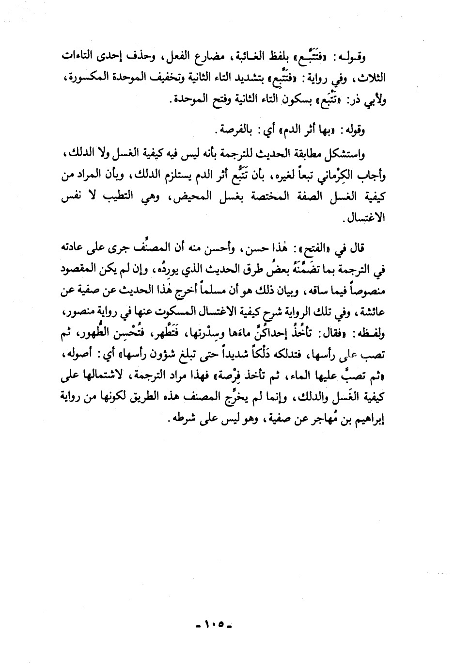 قال في "الفتح": هذا حسن، وأحسن منه أن المصنِّف جرى على عادته في الترجمة بما تضَمَّنَهُ بعضُ طرق الحديث الذي يورِدُه، وإن لم يكن المقصود منصوصًا فيما ساقه، وبيان ذلك هو أن مسلمًا أخرج هذا الحديث عن صفية عن عائشة، وفي تلك الرواية شرح كيفية الاغتسال المسكوت عنها في رواية منصور، ولفظه: "فقال: تأخُذُ إحداكُنَّ ماءَها وسِدْرتها، فَتَطَّهر، فتُحْسِن الطُّهور، ثم تصب على رأسها، فتدلكه دَلْكًا شديدًا حتى تبلغ شؤون رأسها" أي: أصوله، "ثم تصبَّ عليها الماء، ثم تأخذ فِرْصة" فهذا مراد الترجمة، لاشتمالها على كيفية الغَسل والدلك، وإنما لم يخرِّج المصنف هذه الطريق لكونها من رواية إبراهيم بن مُهاجر عن صفية، وهو ليس على شرطه.