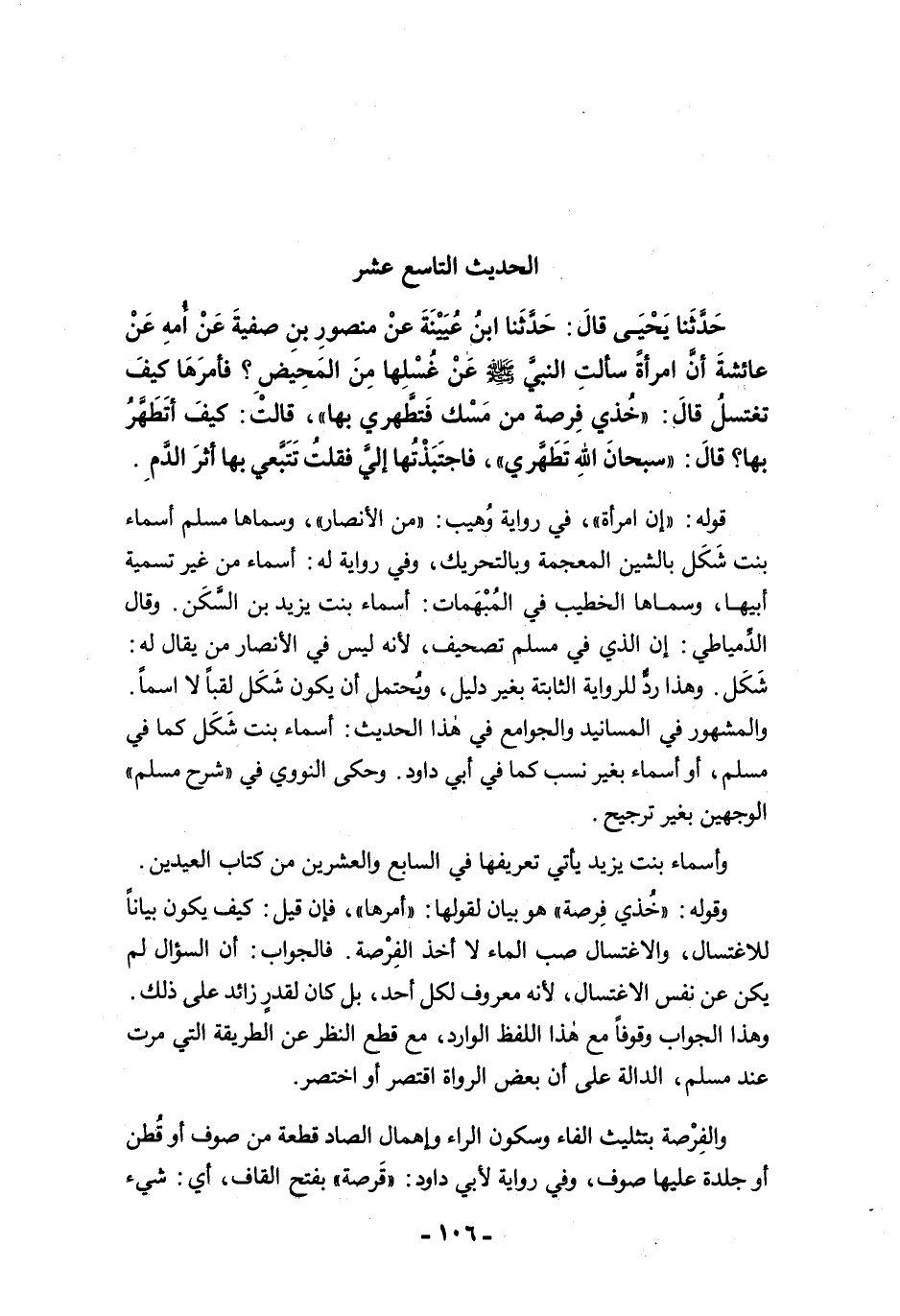 حَدَّثَنَا يَحْيَى قَالَ: حَدَّثَنَا ابْنُ عُيَيْنَةَ عَنْ مَنْصُورِ بْنِ صَفِيَّةَ عَنْ أُمِّهِ عَنْ عَائِشَةَ أَنَّ امْرَأَةً سَأَلَتِ النَّبِيَّ -صلى الله عليه وسلم- عَنْ غُسْلِهَا مِنَ الْمَحِيضِ؟ فَأَمَرَهَا كَيْفَ تَغْتَسِلُ قَالَ: "خُذِى فِرْصَةً مِنْ مِسْكٍ فَتَطَهَّرِي بِهَا". قَالَتْ: كَيْفَ أَتَطَهَّرُ بها؟ قَالَ: "سُبْحَانَ اللَّهِ تَطَهَّرِي". فَاجْتَبَذْتُهَا إِلَيَّ فَقُلْتُ تَتَبَّعِى بِهَا أَثَرَ الدَّمِ.