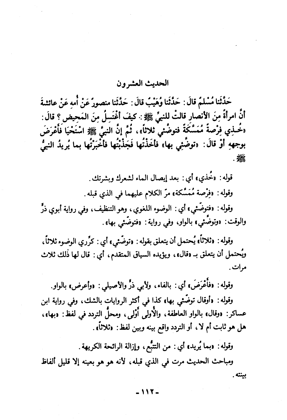 حَدَّثَنَا مُسْلِمٌ قَالَ: حَدَّثَنَا وُهَيْبٌ قَالَ: حَدَّثَنَا مَنْصُورٌ عَنْ أُمِّهِ عَنْ عَائِشَةَ أَنَّ امْرَأَةً مِنَ الأَنْصَارِ قَالَتْ لِلنَّبِيِّ -صلى الله عليه وسلم-: كَيْفَ أَغْتَسِلُ مِنَ الْمَحِيضِ؟ قَالَ: "خُذِي فِرْصَةً مُمَسَّكَةً، فَتَوَضَّئِى ثَلاَثًا". ثُمَّ إِنَّ النَّبِيَّ -صلى الله عليه وسلم- اسْتَحْيَا فَأَعْرَضَ بِوَجْهِهِ أَوْ قَالَ: "تَوَضَّئِى بِهَا" فَأَخَذْتُهَا فَجَذَبْتُهَا فَأَخْبَرْتُهَا بِمَا يُرِيدُ النَّبِيُّ -صلى الله عليه وسلم-.
