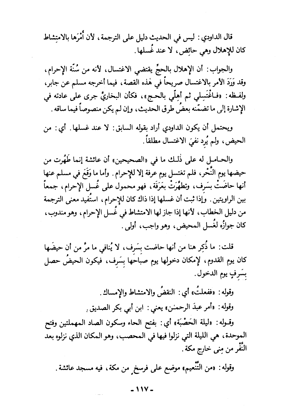 والجواب: أن الإهلال بالحجِّ يقتضي الاغتسال؛ لأنه من سُنّة الإِحرام، وقد وَرَدَ الأمر بالاغتسال صريحًا في هذه القصة، فيما أخرجه مسلم عن جابر، ولفظه: "فاغْتَسِلي ثم أهِلّي بالحج"، فكأن البخاريَّ جرى على عادته في الإشارة إلى ما تضفّنه بعضُ طرق الحديث، وإن لم يكن منصوصًا فيما ساقه.