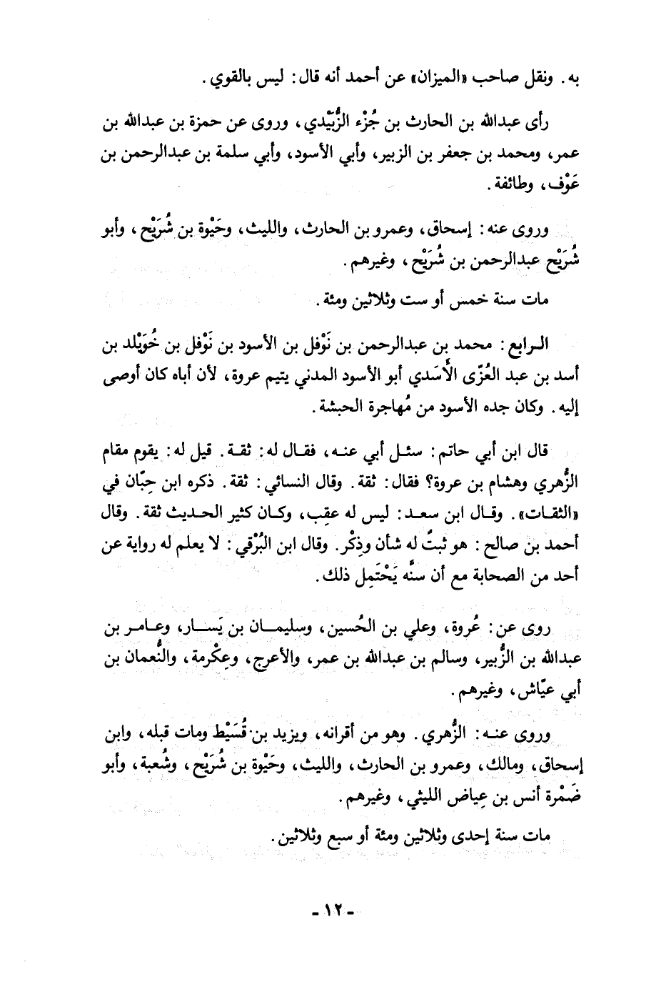 الرابع: محمد بن عبد الرحمن بن نَوْفل بن الأسود بن نَوْفل بن خُوَيْلد بن أسد بن عبد العُزّى الأَسَدي أبو الأسود المدني يتيم عروة؛ لأن أباه كان أوصى إليه. وكان جده الأسود من مُهاجرة الحبشة.