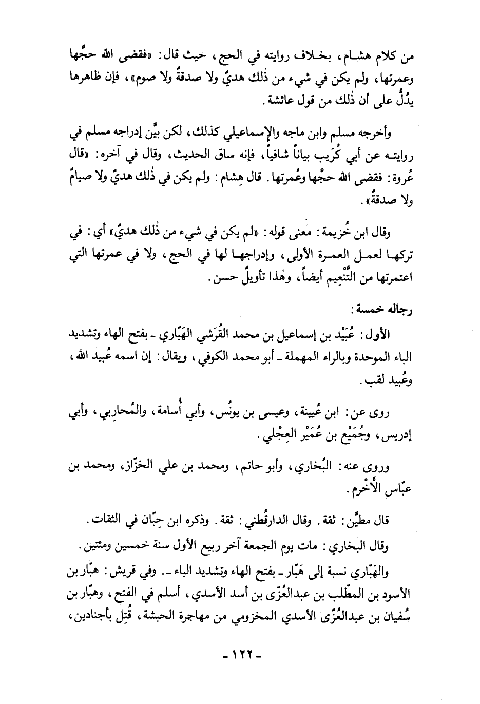 وأخرجه مسلم وابن ماجه والإِسماعيلي كذلك، لكن بيَّن إدراجه مسلم في روايته عن أبي كُرَيب بيانًا شافيًا، فإنه ساق الحديث، وقال في آخره: "قال عُروة: فقضى الله حجَّها وعُمرتها. قال هِشام: ولم يكن في ذلك هديٌ ولا صيامٌ ولا صدقةٌ".