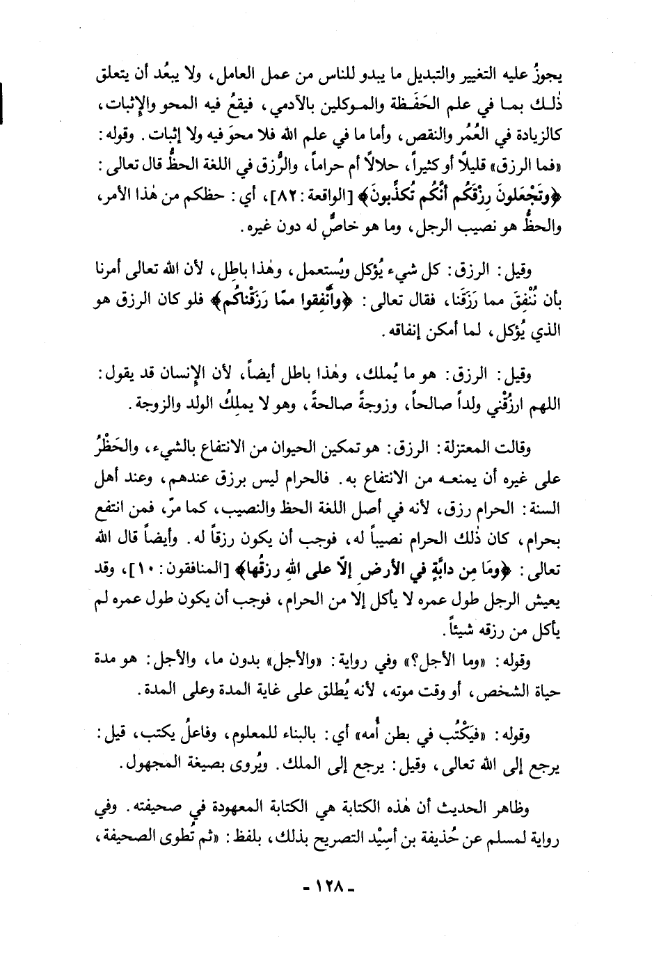 يجوزُ عليه التغيير والتبديل ما يبدو للناس من عمل العامل، ولا يبعُد أن يتعلق ذلك بما في علم الحَفَظة والموكلين بالآدمي، فيقعُ فيه المحو والإِثبات، كالزيادة في العُمُر والنقص، وأما ما في علم الله فلا محوَ فيه ولا إثبات. وقوله: "فما الرزق" قليلًا أو كثيرًا، حلالًا أم حرامًا، والرُّزق في اللغة الحظُّ قال تعالى: {وَتَجْعَلُونَ رِزْقَكُمْ أَنَّكُمْ تُكَذِّبُونَ (82)} [الواقعة: 82]، أي: حظكم من هذا الأمر، والحظُّ هو نصيب الرجل، وما هو خاصٌّ له دون غيره.