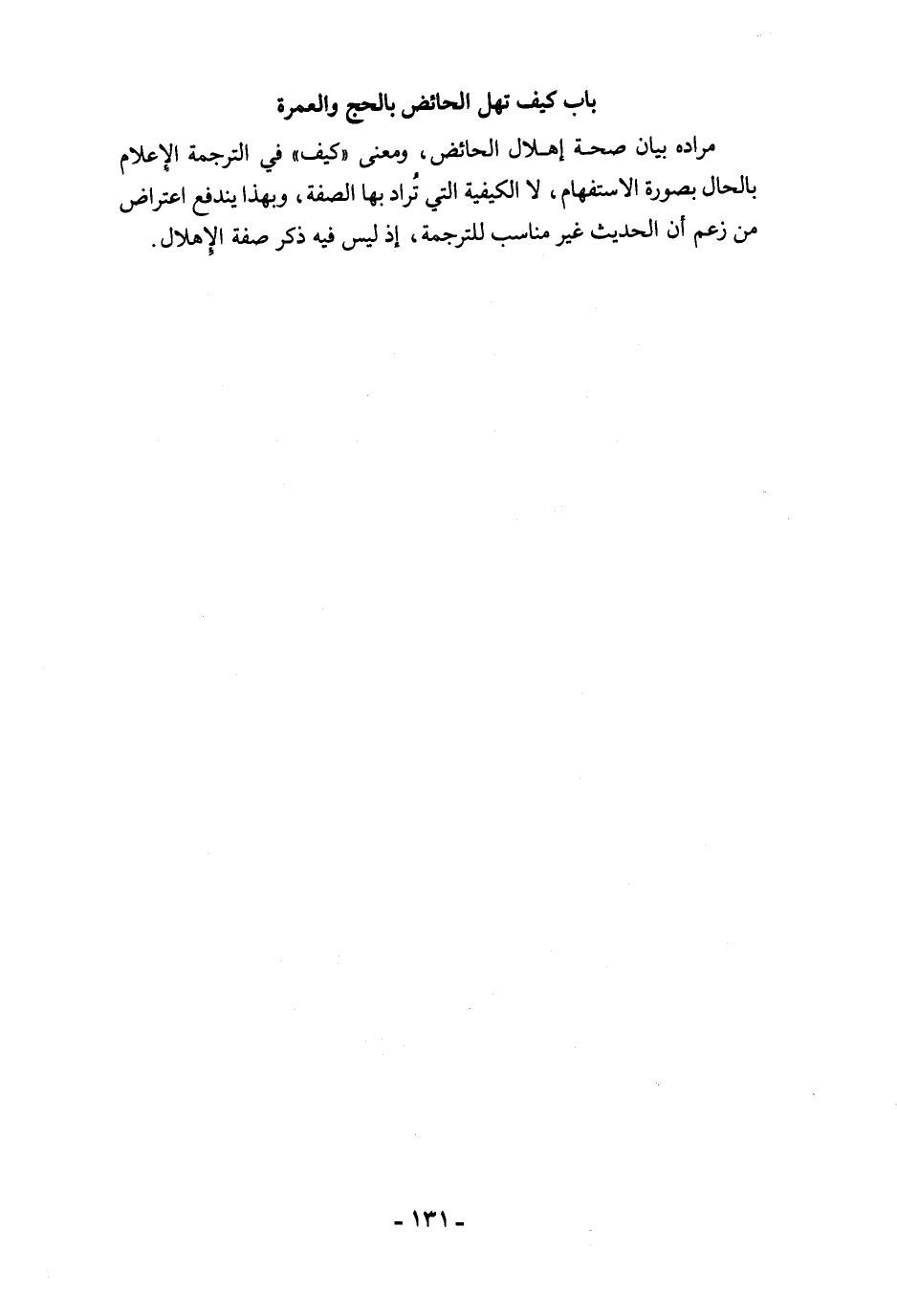 مراده بيان صحة إهلال الحائض، ومعنى "كيف" في الترجمة الإعلام بالحال بصورة الاستفهام، لا الكيفية التي تُراد بها الصفة، وبهذا يندفع اعتراض من زعم أن الحديث غير مناسب للترجمة، إذ ليس فيه ذكر صفة الإهلال.