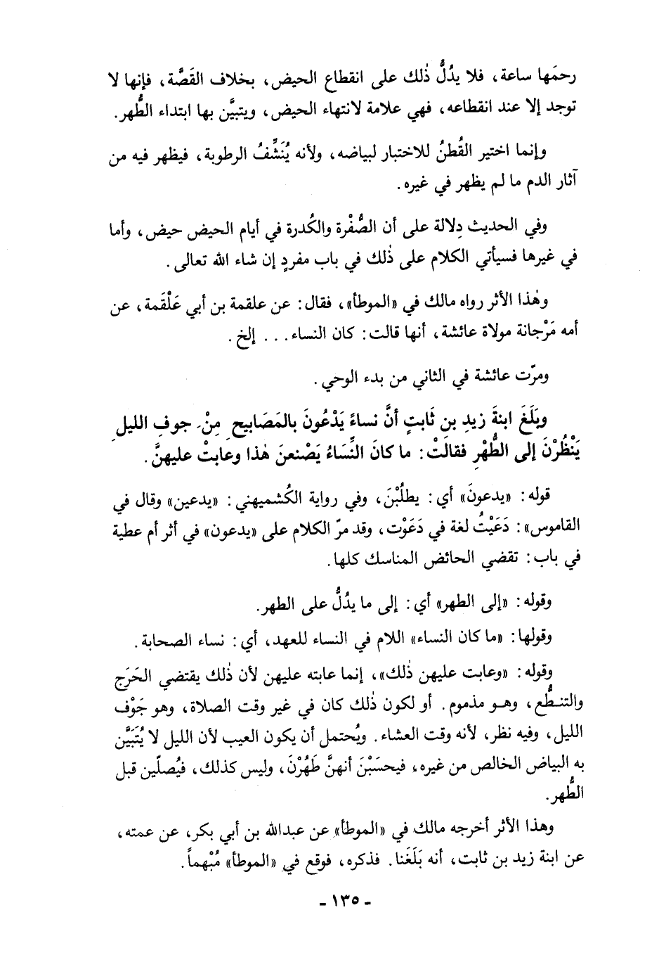 وَبَلَغَ ابْنَةَ زَيْدِ بْنِ ثَابِتٍ أَنَّ نِسَاءً يَدْعُونَ بِالْمَصَابِيحِ مِنْ جَوْفِ اللَّيْلِ يَنْظُرْنَ إِلَى الطُّهْرِ فَقَالَتْ: مَا كَانَ النِّسَاءُ يَصْنَعْنَ هَذَا. وَعَابَتْ عَلَيْهِنَّ.