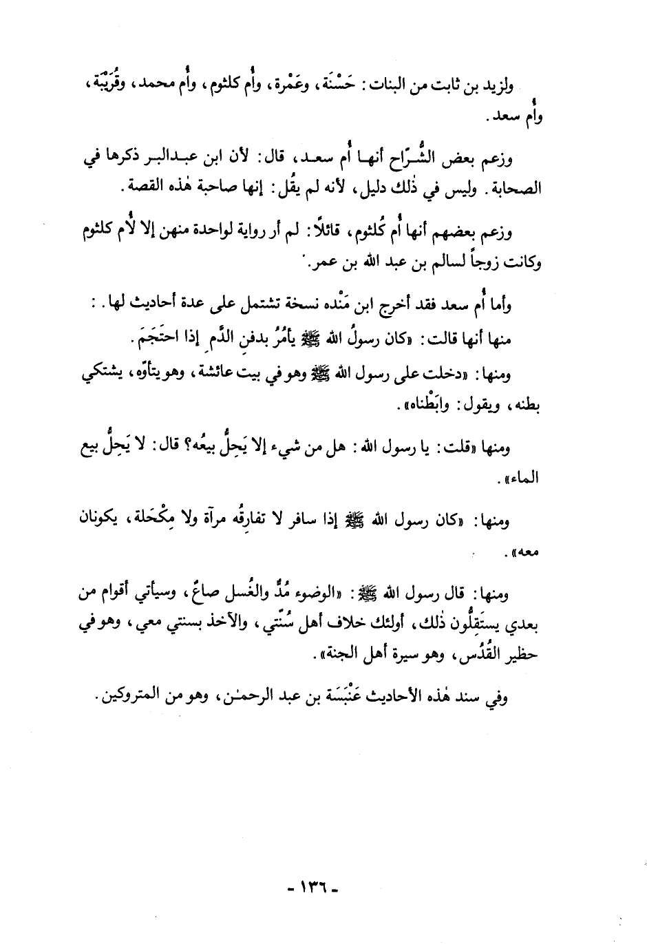 ولزيد بن ثابت من البنات: حَسْنَة، وعَمْرة، وأُم كلثوم، وأُم محمد، وقُرَيْبَة، وأُم سعد.