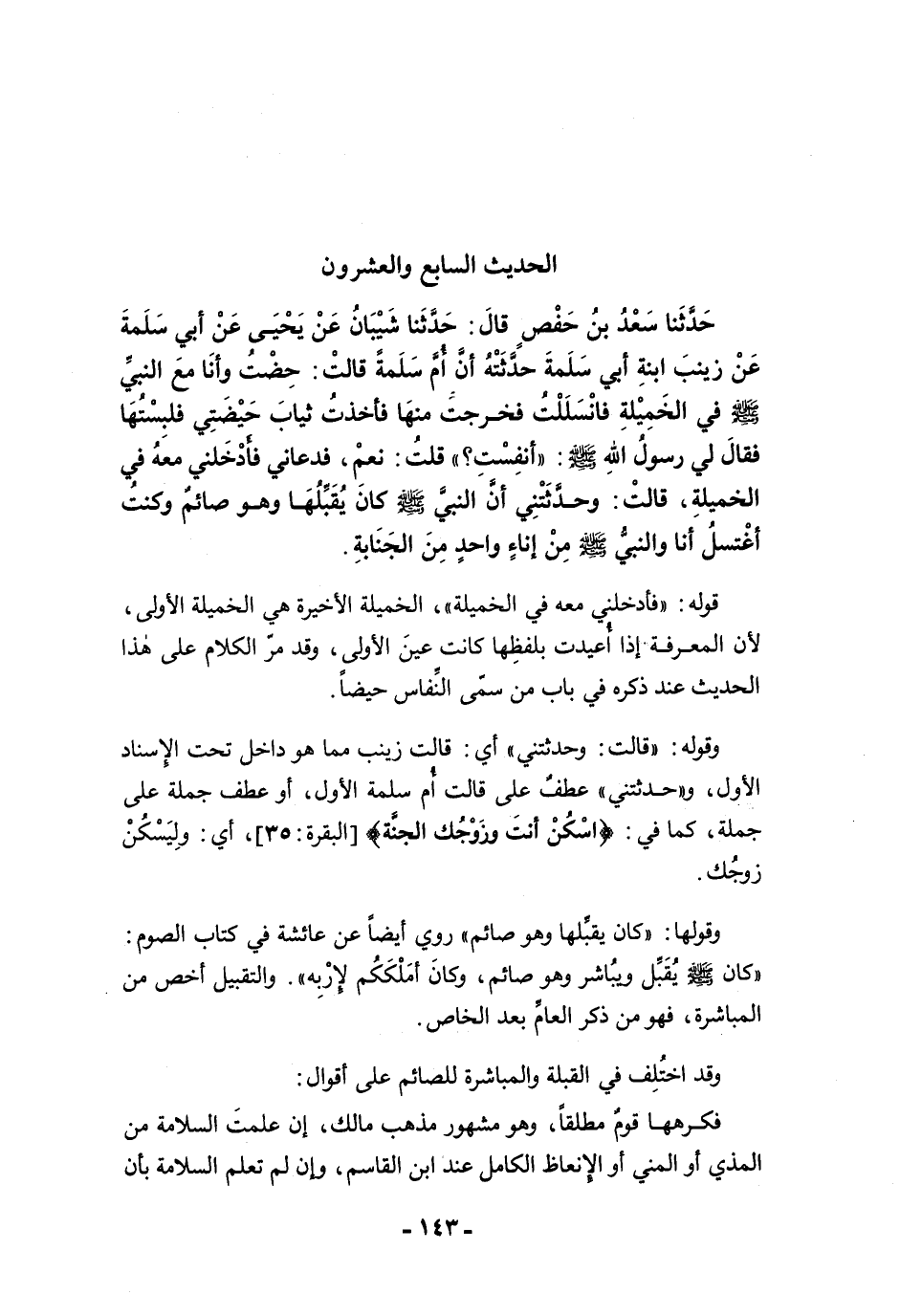 حَدَّثَنَا سَعْدُ بْنُ حَفْصٍ قَالَ: حَدَّثَنَا شَيْبَانُ عَنْ يَحْيَى عَنْ أَبِي سَلَمَةَ عَنْ زَيْنَبَ ابْنَةِ أَبِي سَلَمَةَ حَدَّثَتْهُ أَنَّ أُمَّ سَلَمَةَ قَالَتْ: حِضْتُ وَأَنَا مَعَ النَّبِيِّ -صلى الله عليه وسلم- فِى الْخَمِيلَةِ، فَانْسَلَلْتُ فَخَرَجْتُ مِنْهَا، فَأَخَذْتُ ثِيَابَ حِيضَتِي فَلَبِسْتُهَا، فَقَالَ لِي رَسُولُ اللَّهِ -صلى الله عليه وسلم-: "أَنُفِسْتِ؟ ". قُلْتُ: نَعَمْ، فَدَعَانِي فَأَدْخَلَنِي مَعَهُ فِى الْخَمِيلَةِ. قَالَتْ: وَحَدَّثَتْنِي أَنَّ النَّبِيَّ -صلى الله عليه وسلم- كَانَ يُقَبِّلُهَا وَهُوَ صَائِمٌ، وَكُنْتُ أَغْتَسِلُ أَنَا وَالنَّبِيُّ -صلى الله عليه وسلم- مِنْ إِنَاءٍ وَاحِدٍ مِنَ الْجَنَابَةِ.