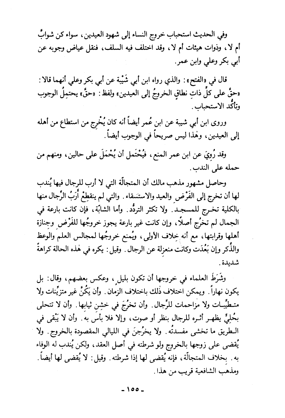 قال في "الفتح": والذي رواه ابن أبي شَيْبة عن أبي بكر وعلي أنهما قالا: "حقَّ على كلِّ ذاتِ نطاقٍ الخروجُ إلى العيدين" ولفظ: "حقَّ" يحتمِلُ الوجوب وتأكُّد الاستحباب.