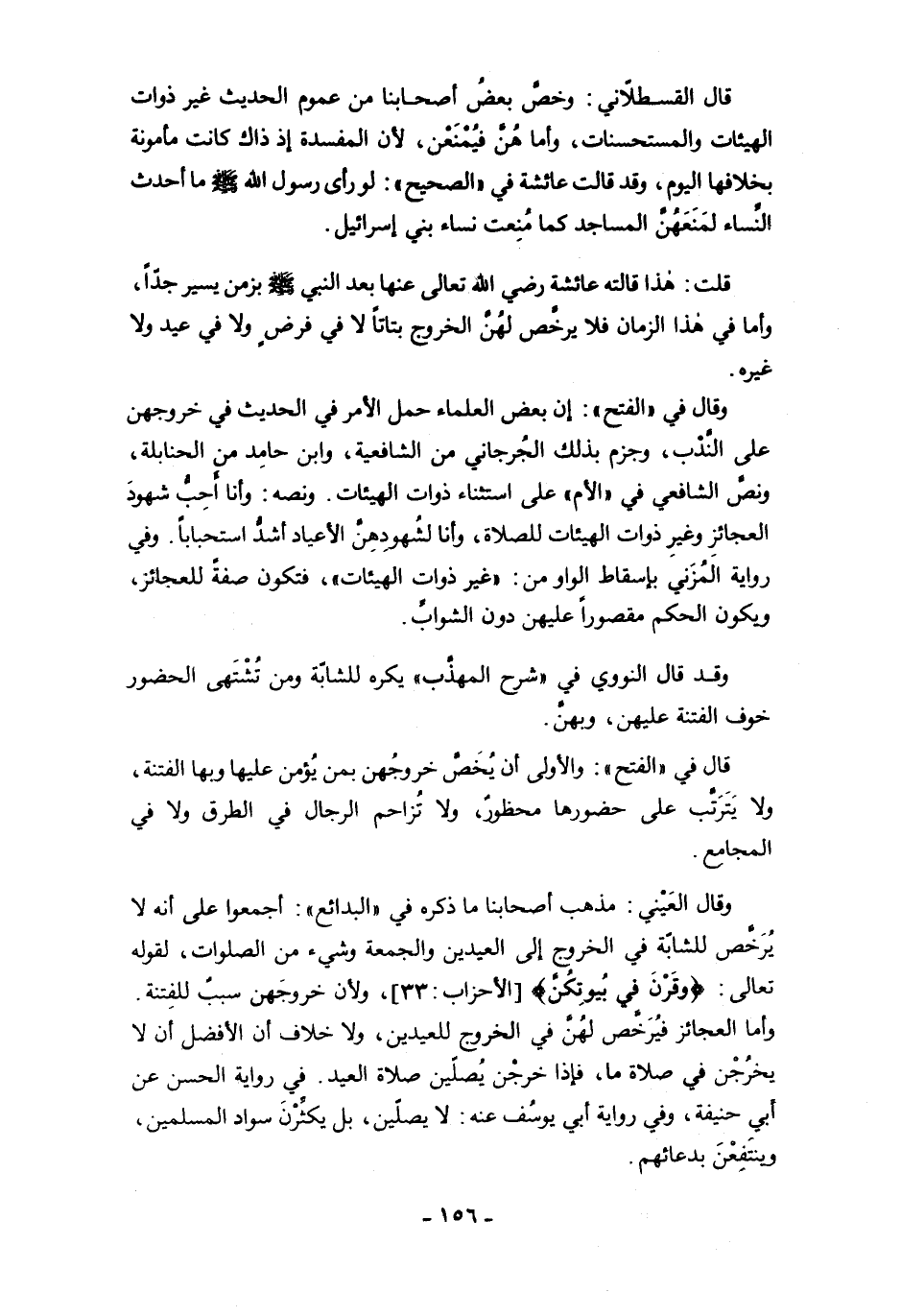 وقال في "الفتح": إن بعض العلماء حمل الأمر في الحديث في خروجهن على النَّدْب، وجزم بذلك الجُرجاني من الشافعية، وابن حامِد من الحنابلة، ونصَّ الشافعي في "الأم" على استثناء ذوات الهيئات. ونصه: وأنا أَحِبُّ شهودَ العجائزِ وغيرِ ذوات الهيئات للصلاة، وأنا لشُهودِهِنَّ الأعياد أشدُّ استحبابًا. وفي رواية المُزَني بإسقاط الواو من: "غير ذوات الهيئات"، فتكلون صفة للعجائز، ويكون الحكم مقصورًا عليهن دون الشوابِّ.