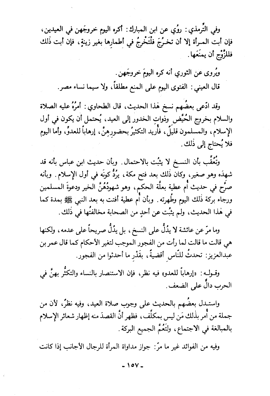 وتُعُقِّب بأن النسخ لا يثبُت بالاحتمال. وبأن حديث ابن عباس بأنه قد شهِدَه وهو صغير، وكان ذلك بعد فح مكة، يرُدُّ كونَه في أول الإِسلام. وبأنه صرَّح في حديث أُم عطية بعلَّة الحكم، وهو شهودُهُنَّ الخير ودعوةَ المسلمين ورجاء بركة ذلك اليوم وطُهرته. وبأن أُم عطية أفتت به بعد النبي -صلى الله عليه وسلم- بمدة كما في هذا الحديث، ولم يثبُت عن أحدٍ من الصحابة مخالفتُها في ذلك.