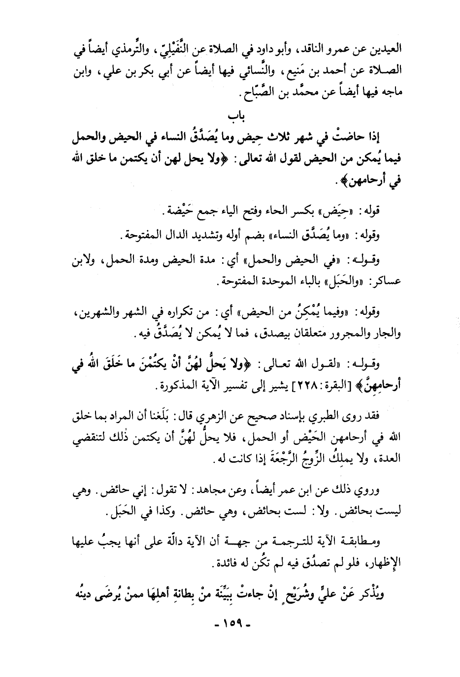 باب إذا حاضتْ في شهر ثلاث حِيض وما يُصَدَّقُ النساء في الحيض والحمل فيما يُمكن من الحيض لقول الله تعالى: {وَلَا يَحِلُّ لَهُنَّ أَنْ يَكْتُمْنَ مَا خَلَقَ اللَّهُ فِي أَرْحَامِهِنَّ}