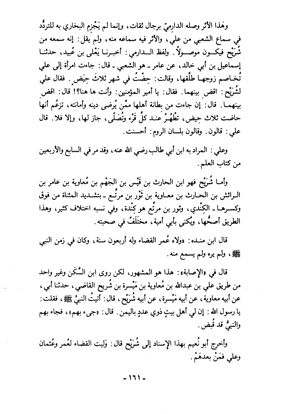وهذا الأثر وصله الدارِميّ برجال ثقات، وإنما لم يَجْزِم البخاري به للتردُّد في سماع الشعبي من علي، والأثر فيه سماعه منه، ولم يقل: إنه سمعه من شُرَيْح فيكون موصولًا. ولفظ الدارمي: أخبرنا يَعْلى بن عُبيد، حدثنا إسماعيل بن أبي خالد، عن عامر -هو الشعبي- قال: جاءت امرأة إلى علي تُخاصم زوجها طلَّقها، وقالت: حِضْتُ في شهر ثلاثَ حِيَضٍ. فقال علي لشُرَيْح: اقضِ بينهما. فقال: يا أمير المؤمنين: وأنت ها هنا؟! قال: اقض بينهما. قال: ان جاءت من بِطانة أهلها ممَّن يُرضى دينه وأمانته، تزعُم أنها حاضت ثلاث حِيض، تطْهُرُ عند كل قَرْء وتُصَلّى، جاز لها، وإلا فلا. قال علي: قالون. وقالون بلسان الروم: أحسنت.
