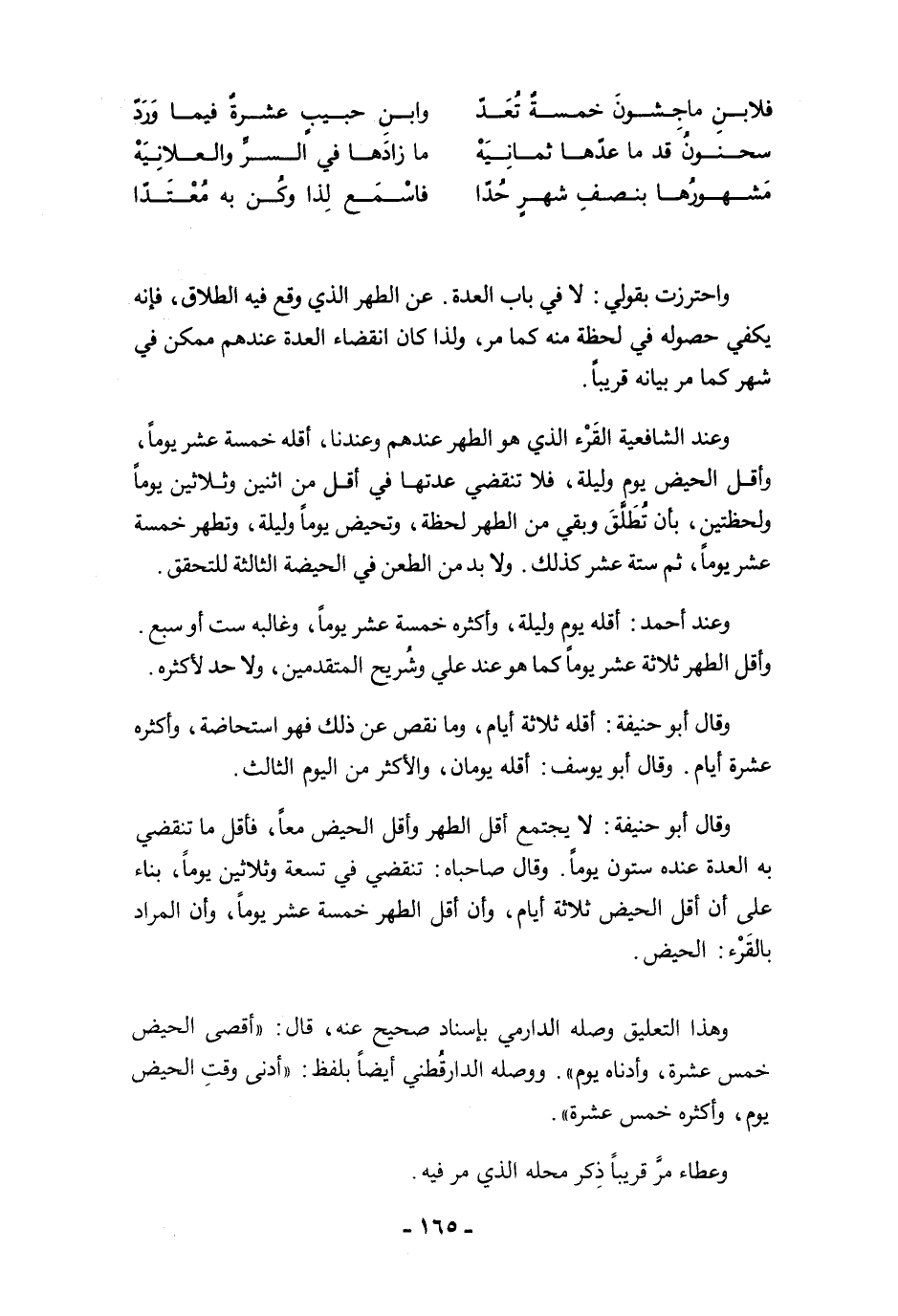 واحترزت بقولي: لا في باب العدة. عن الطهر الذي وقع فيه الطلاق، فإنه يكفي حصوله في لحظة منه كما مر، ولذا كان انقضاء العدة عندهم ممكن في شهر كما مرَّ بيانه قريبًا.