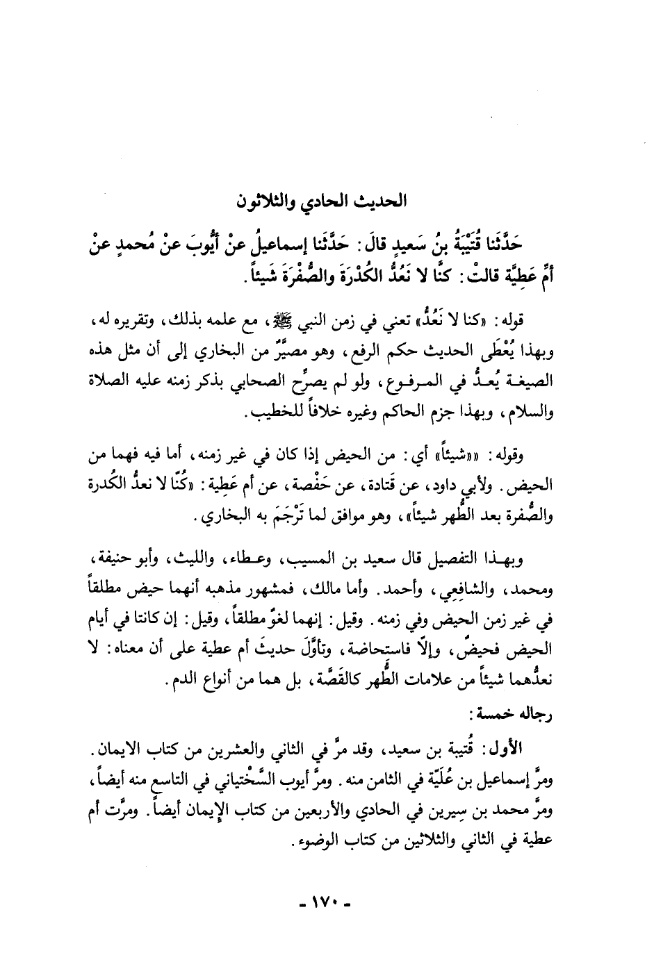 الأول: قُتيبة بن سعيد، وقد مرَّ في الثاني والعشرين من كتاب الإيمان. ومرَّ إسماعيل بن عُلَيّة في الثامن منه. ومرَّ أيوب السَّحْتياني في التاسع منه أيضًا، ومرَّ محمد بن سِيرين في الحادي والأربعين من كتاب الإيمان أيضًا. ومرَّت أم عطية في الثاني والثلاثين من كتاب الوضوء.