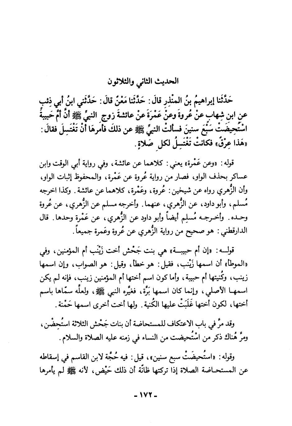 حَدَّثَنَا إِبْرَاهِيمُ بْنُ الْمُنْذِرِ قَالَ: حَدَّثَنَا مَعْنٌ قَالَ: حَدَّثَنِى ابْنُ أَبِي ذِئْبٍ عَنِ ابْنِ شِهَابٍ عَنْ عُرْوَةَ وَعَنْ عَمْرَةَ عَنْ عَائِشَةَ زَوْجِ النَّبِيِّ -صلى الله عليه وسلم- أَنَّ أُمَّ حَبِيبَةَ اسْتُحِيضَتْ سَبْعَ سِنِينَ، فَسَأَلَتْ رَسُولَ اللَّهِ -صلى الله عليه وسلم- عَنْ ذَلِكَ، فَأَمَرَهَا أَنْ تَغْتَسِلَ فَقَالَ: "هَذَا عِرْقٌ". فَكَانَتْ تَغْتَسِلُ لِكُلِّ صَلاَةٍ.