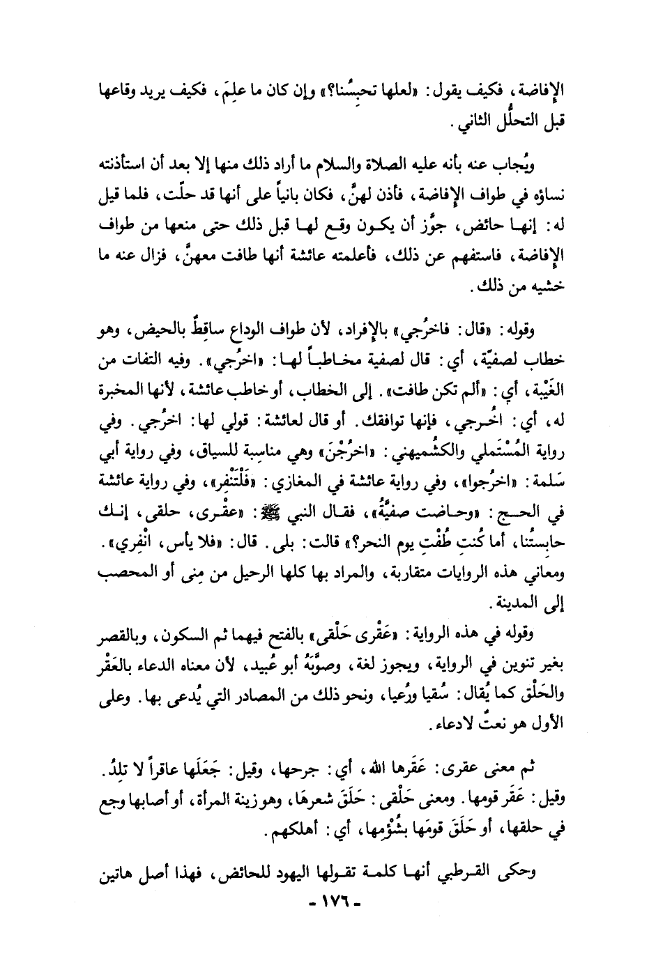 وقوله في هذه الرواية: "عَقْرى حَلْقى" بالفتح فيهما ثم السكون، وبالقصر بغير تنوين في الرواية، ويجوز لغة، وصوَّبَهُ أبو عُبيد؛ لأن معناه الدعاء بالعَقْر والحَلْق كما يُقال: سُقيا ورُعيا، ونحو ذلك من المصادر التي يُدعى بها. وعلى الأول هو نعتٌ لادعاء.