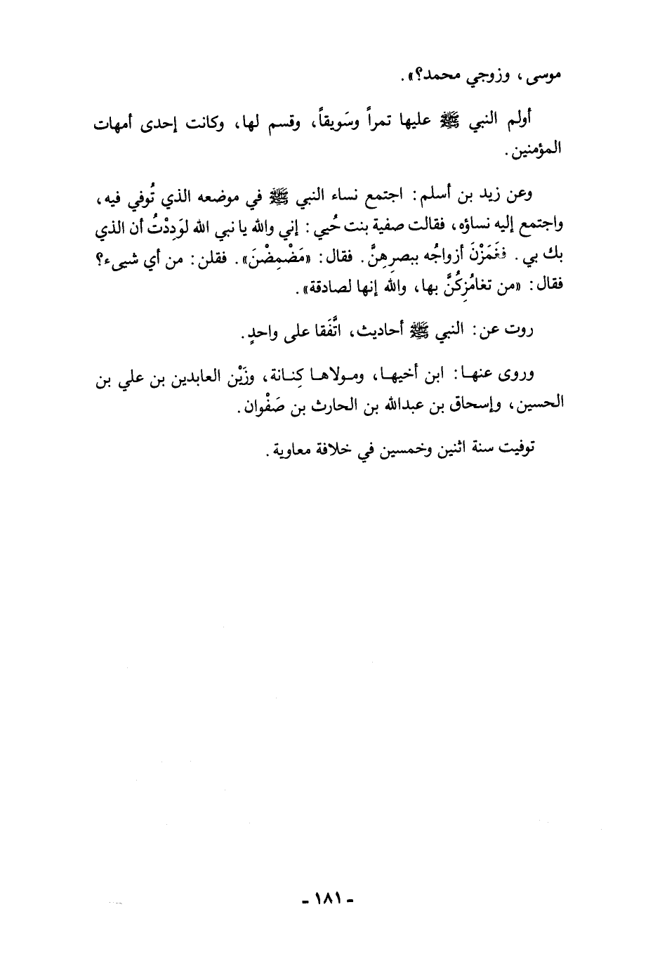 وعن زيد بن أسلم: اجتمع نساء النبي -صلى الله عليه وسلم- في موضعه الذي تُوفي فيه، واجتمع إليه نساؤه، فقالت صفية بنت حُيي: إني والله يا نبي الله لوَدِدْتُ أن الذي بك بي. فغَمَزْنَ أزواجُه ببصرِهِنَّ. فقال: "مَضْمِضْنَ". فقلن: من أي شيىء؟ فقال: "من تغامُزِكُنَّ بها، والله إنها لصادقة".