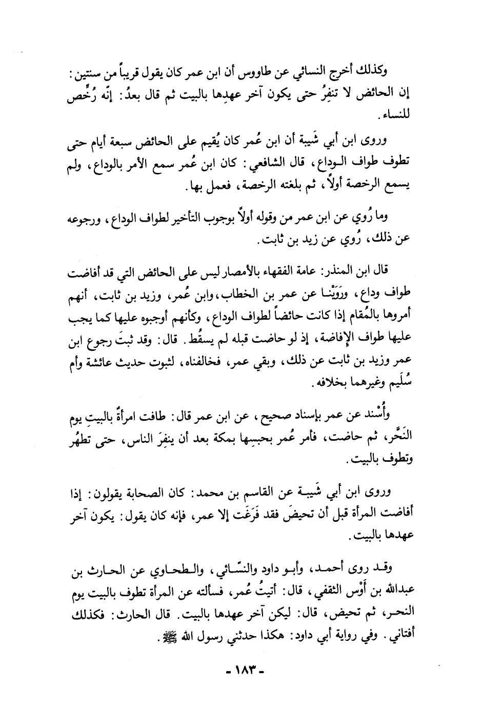 وكذلك أخرج النسائي عن طاووس أن ابن عمر كان يقول قريبًا من سنتين: إن الحائض لا تنفِرُ حتى يكون آخر عهدِها بالبيت ثم قال بعدُ: إنّه رُخِّص للنساء.