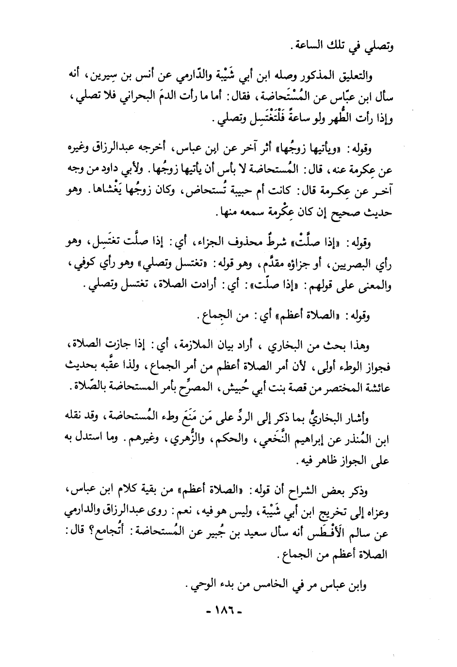 وذكر بعض الشراح أن قوله: "الصلاة أعظم" من بقية كلام ابن عباس، وعزاه إلى تخريج ابن أبي شَيْبة، وليس هو فيه، نعم: روى عبد الرزاق والدارمي عن سالم الأَفْطَس أنه سأل سعيد بن جُبير عن المُستحاضة: أتُجامع؟ قال: الصلاة أعظم من الجماع.
