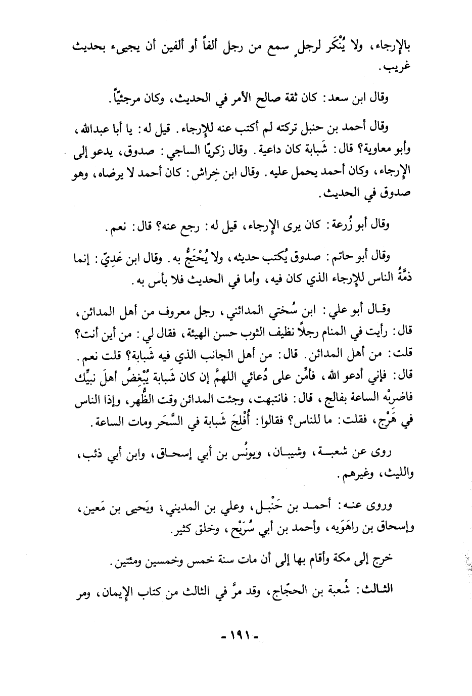 وقال أبو حاتم: صدوق يُكتب حديثه، ولا يُحْتَجُّ به. وقال ابن عَدِيّ: إنما ذمَّةُ الناس للإرجاء الذي كان فيه، وأما في الحديث فلا بأس به.