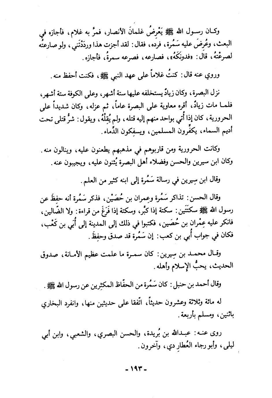 وقال أحمد بن حنبل: كان سَمُرة من الحفّاظ المكثِرين عن رسول الله -صلى الله عليه وسلم-.