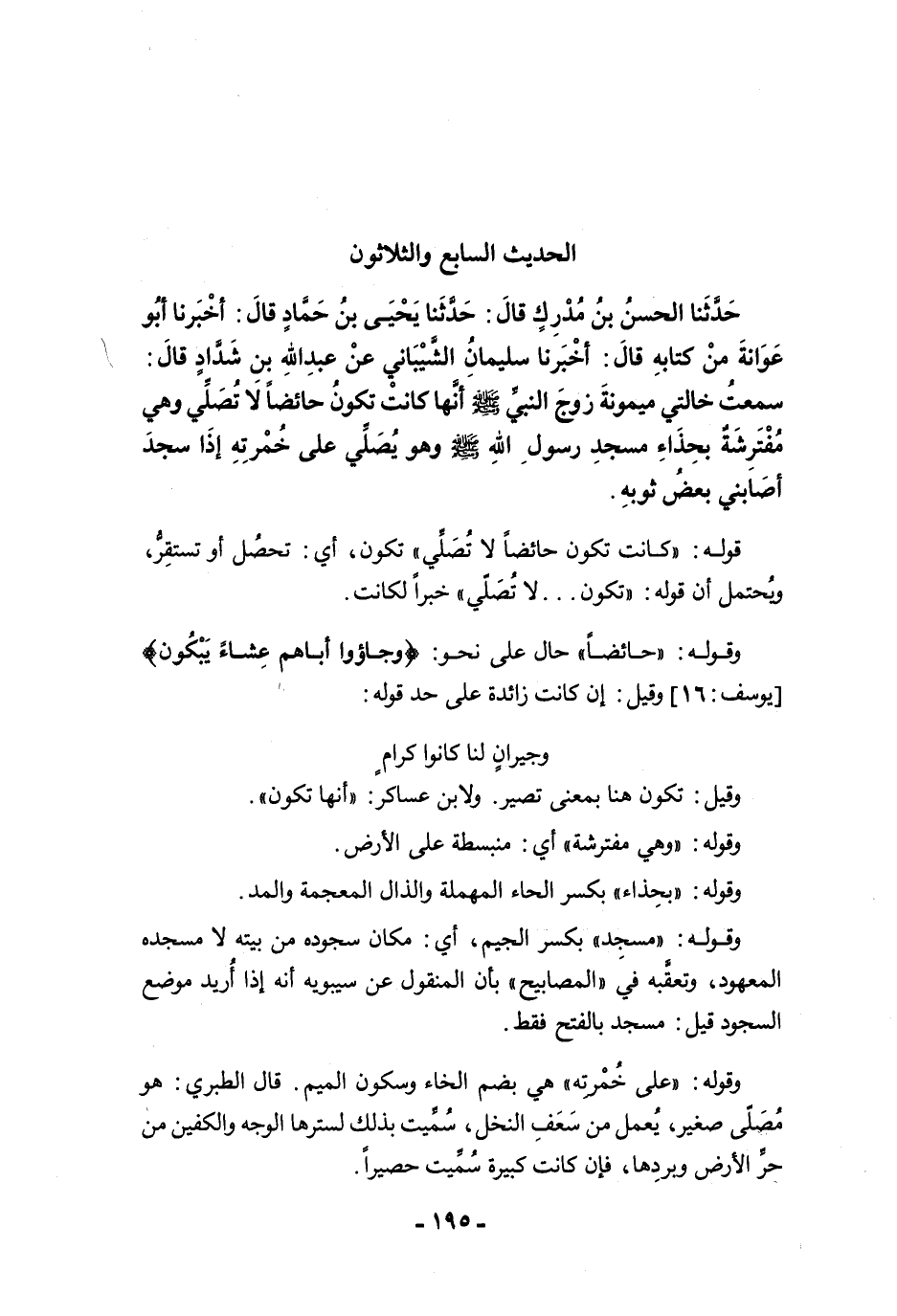 حَدَّثَنَا الْحَسَنُ بْنُ مُدْرِكٍ قَالَ: حَدَّثَنَا يَحْيَى بْنُ حَمَّادٍ قَالَ: أَخْبَرَنَا أَبُو عَوَانَةَ مِنْ كِتَابِهِ قَالَ: أَخْبَرَنَا سُلَيْمَانُ الشَّيْبَانِيُّ عَنْ عَبْدِ اللَّهِ بْنِ شَدَّادٍ قَالَ: سَمِعْتُ خَالَتِي مَيْمُونَةَ زَوْجَ النَّبِيِّ -صلى الله عليه وسلم- أَنَّهَا كَانَتْ تَكُونُ حَائِضًا لاَ تُصَلِّي، وَهْيَ مُفْتَرِشَةٌ بِحِذَاءِ مَسْجِدِ رَسُولِ اللَّهِ -صلى الله عليه وسلم- وَهْوَ يُصَلِّي عَلَى خُمْرَتِهِ، إِذَا سَجَدَ أَصَابَنِي بَعْضُ ثَوْبِهِ.