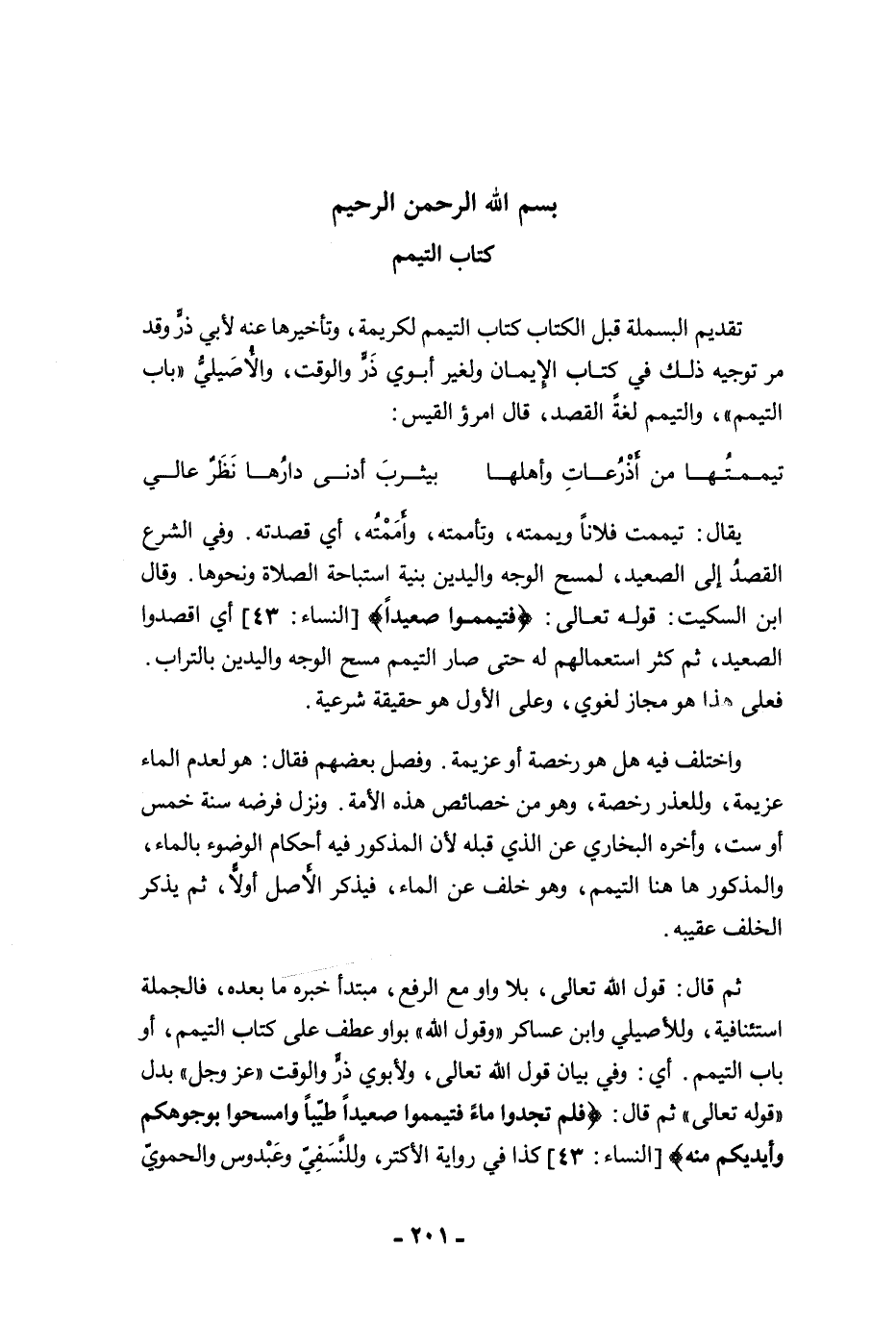 تقديم البسملة قبل الكتاب كتاب التيمم لكريمة، وتأخيرها عنه لأبي ذرٍّ وقد مرَّ توجيه ذلك في كتاب الإيمان ولغير أبوي ذَرٍّ والوقت، والأُصَيليُّ "باب التيمم"، والتيمم لغةً القصد، قال امرؤ القيس: