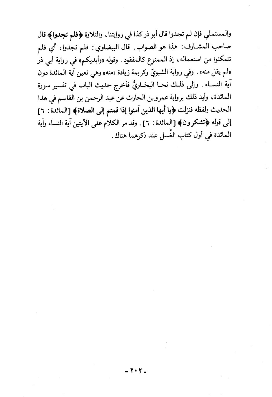 والمستملي فإن لم تجدوا قال أبو ذر كذا في روايتنا، والتلاوة {فَلَمْ تَجِدُوا} قال صاحب المشارف: هذا هو الصواب. قال البيضاوي: فلم تجدوا، أي فلم تتمكنوا من استعماله، إذ الممنوع كالمفقود. وقوله "وأيديكم" في رواية أبي ذر "لم يقل منه". وفي رواية الشبويّ وكريمة زيادة "منه" وهي تعين آية المائدة دون آية النساء. وإلى ذلك نحا البخاريُّ فأخرج حديث الباب في تفسير سورة المائدة، وأيد ذلك برواية عمرو بن الحارث عن عبد الرحمن بن القاسم في هذا الحديث ولفظه فنزلت {يَاأَيُّهَا الَّذِينَ آمَنُوا إِذَا قُمْتُمْ إِلَى الصَّلَاةِ} [المائدة: 6] إلى قوله {تَشْكُرُونَ} [المائدة: 6]. وقد مرَّ الكلام على الآيتين آية النساء وآية المائدة في أول كتاب الغُسل عند ذكرهما هناك.