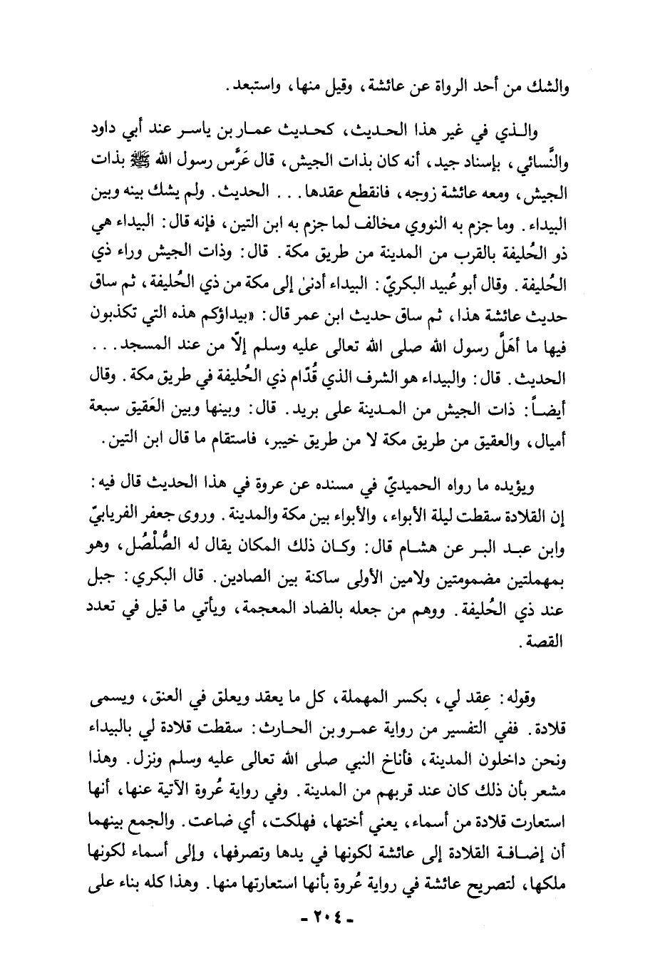 والذي في غير هذا الحديث، كلحديث عمار بن ياسر عند أبي داود والنَّسائي، بإسناد جيد، أنه كان بذات الجيش، قال عَرَّس رسول الله -صلى الله عليه وسلم- بذات الجيش، ومعه عائشة زوجه، فانقطع عقدها ... الحديث. ولم يشك بينه وبين البيداء. وما جزم به النووي مخالف لما جزم به ابن التين، فإنه قال: البيداء هي ذو الحُليفة بالقرب من المدينة من طريق مكة. قال: وذات الجيش وراء ذي الحُليفة. وقال أبو عُبيد البكريّ: البيداء أدنى إلى مكة من ذي الحُليفة، ثم ساق حديث عائشة هذا، ثم ساق حديث ابن عمر قال: "بيداؤكم هذه التي تكذبون فيها ما أهَلَّ رسول الله صلى الله تعالى عليه وسلم إلاّ من عند المسجد ... الحديث. قال: والبيداء هو الشرف الذي قُدّام ذي الحُليفة في طريق مكة. وقال أيضًا: ذات الجيش من المدينة على بريد. قال: وبينها وبين العَقيق سبعة أميال، والعقيق من طريق مكة لا من طريق خيبر، فاستقام ما قال ابن التين.