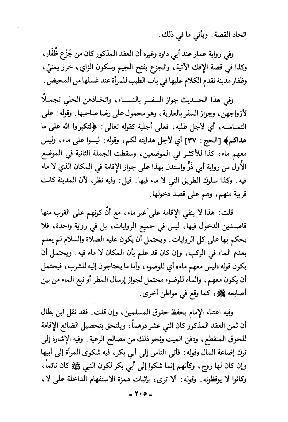 وفي هذا الحديث جواز السفر بالنساء، واتخاذهن الحلي تجملًا لأزواجهن، وجواز السفر بالعارية، وهو محمول على رضا صاحبها. وقوله: على التماسه، أي لأجل طلبه، فعلى أجلية كقوله تعالى: {لِتُكَبِّرُوا اللَّهَ عَلَى مَا هَدَاكُمْ} [الحج: 37] أي لأجل هدايته لكم، وقوله: ليسوا على ماء، وليس معهم ماء، كذا للأكثر في الموضعين، وسقطت الجملة الثانية في الموضع الأول من رواية أبي ذَرٍّ واستدل بهذا على جواز الإِقامة في المكان الذي لا ماء فيه. وكذا سلوك الطريق التي لا ماء فيها. قيل: وفيه نظر، لأن المدينة كانت قريبة منهم، وهم على قصد دخولها.