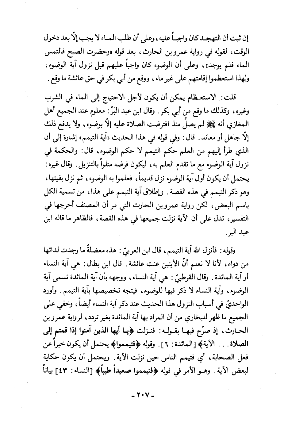 قلت: الاستعظام يمكن أن يكون لأجل الاحتياج إلى الماء في الشرب وغيره، وكذلك ما وقع في أبي بكر. وقال ابن عبد البَرّ: معلوم عند الجميع أهل المغازي أنه -صلى الله عليه وسلم- لم يصلِّ منذ افترضت الصلاة عليه إلاّ بوضوء، ولا يدفع ذلك إلاّ جاهل أو معاند. قال: وفي قوله في هذا الحديث "آية التيمم" إشارة إلى أن الذي طرأ إليهم من العلم حكم التيمم لا حكم الوضوء، قال: والحكمة في نزول آية الوضوء مع ما تقدم العلم به، ليكون فرضه متلواً بالتنزيل. وقال غيره: يحتمل أن يكون أول آية الوضوء نزل قديمًا، فعلموا به الوضوء، ثم نزل بقيتها، وهو ذكر التيمم في هذه القصة. وإطلاق آية التيمم على هذا، من تسمية الكل باسم البعض، لكن رواية عمرو بن الحارث التي مرَّ أن المصنف أخرجها في التفسير، تدل على أن الآية نزلت جميعها في هذه القصة، فالظاهر ما قاله ابن عبد البر.