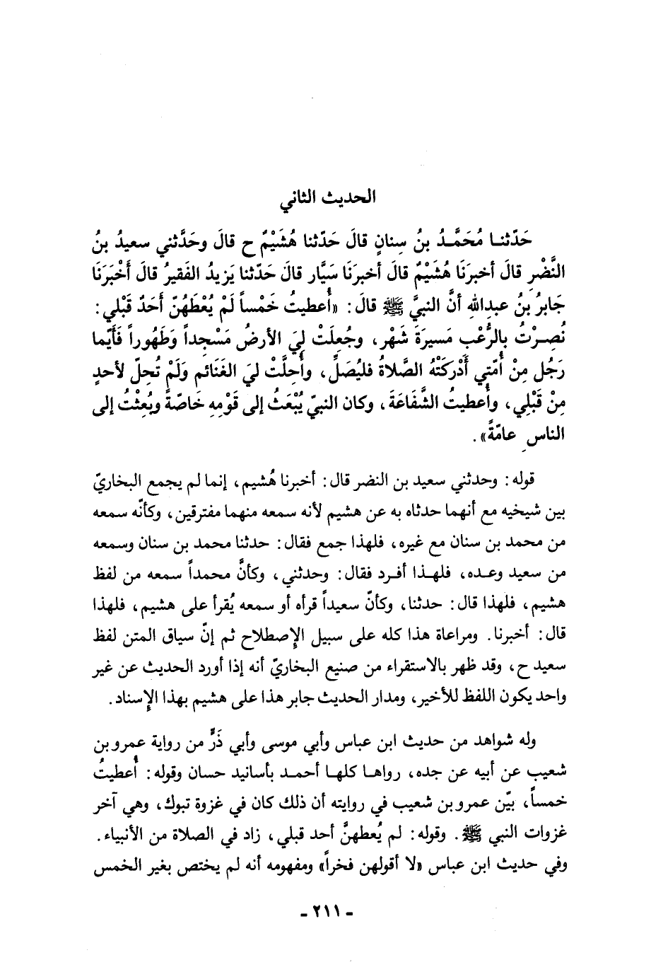 حَدَّثَنَا مُحَمَّدُ بْنُ سِنَانٍ قَالَ حَدَّثَنَا هُشَيْمٌ ح قَالَ وَحَدَّثَنِي سَعِيدُ بْنُ النَّضْرِ قَالَ أَخْبَرَنَا هُشَيْمٌ قَالَ أَخْبَرَنَا سَيَّارٌ قَالَ حَدَّثَنَا الْفَقِيرُ قَالَ أَخْبَرَنَا جَابِرُ بْنُ عَبْدِ اللَّهِ أَنَّ النَّبِيَّ -صلى الله عليه وسلم- قَالَ: "أُعْطِيتُ خَمْسًا لَمْ يُعْطَهُنَّ أَحَدٌ قَبْلِي: نُصِرْتُ بِالرُّعْبِ مَسِيرَةَ شَهْرٍ، وَجُعِلَتْ لِيَ الأَرْضُ مَسْجِدًا وَطَهُورًا، فَأَيُّمَا رَجُلٍ مِنْ أُمَّتِي أَدْرَكَتْهُ الصَّلاَةُ فَلْيُصَلِّ، وَأُحِلَّتْ لِيَ الْمَغَانِمُ وَلَمْ تَحِلَّ لأَحَدٍ قَبْلِي، وَأُعْطِيتُ الشَّفَاعَةَ، وَكَانَ النَّبِيُّ يُبْعَثُ إِلَى قَوْمِهِ خَاصَّةً، وَبُعِثْتُ إِلَى النَّاسِ عَامَّةً".