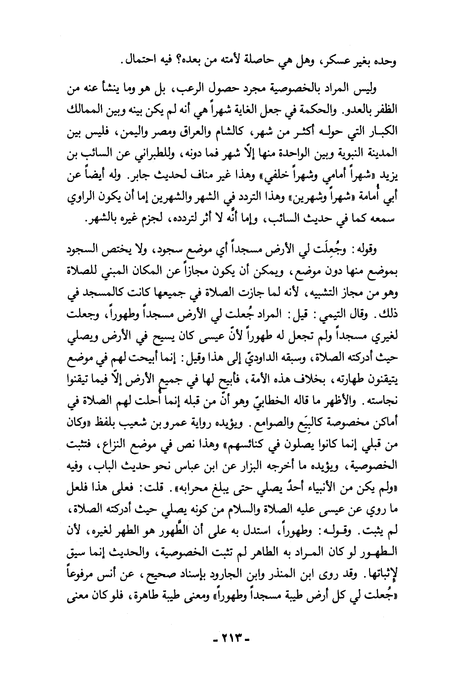 وقوله: وجُعِلَت لي الأرض مسجدًا أي موضع سجود، ولا يختص السجود بموضع منها دون موضع، ويمكن أن يكون مجازًا عن المكان المبني للصلاة وهو من مجاز التشبيه، لأنه لما جازت الصلاة في جميعها كانت كالمسجد في ذلك. وقال التيمي: قيل: المراد جُعلت لي الأرض مسجدًا وطهورًا، وجعلت لغيري مسجدًا ولم تجعل له طهورًا لأنَّ عيسى كان يسيح في الأرض ويصلي حيث أدركته الصلاة، وسبقه الداوديّ إلى هذا وقيل: إنما أبيحت لهم في موضع يتيقنون طهارته، بخلاف هذه الأمة، فأبيح لها في جميع الأرض إلاّ فيما تيقنوا نجاسته. والأظهر ما قاله الخطابيّ وهو أنّ من قبله إنما أُحلت لهم الصلاة في أماكن مخصوصة كالبِيَع والصوامع. ويؤيده رواية عمرو بن شعيب بلفظ "وكان من قبلي إنما كانوا يصلون في كنائسهم" وهذا نص في موضع النزاع، فتثبت الخصوصية، ويؤيده ما أخرجه البزار عن ابن عباس نحو حديث الباب، وفيه "ولم يكن من الأنبياء أحدٌ يصلي حتى يبلغ محرابه". قلت: فعلى هذا فلعل ما روي عن عيسى عليه الصلاة والسلام من كونه يصلي حيث أدركته الصلاة، لم يثبت. وقوله: وطهورًا، استدل به على أن الطَّهور هو الطهر لغيره؛ لأن الطهور لو كان المراد به الطاهر لم تثبت الخصوصية، والحديث إنما سيق لإثباتها. وقد روى ابن المنذر وابن الجارود بإسناد صحيح، عن أنس مرفوعًا "جُعلت لي كل أرض طيبة مسجدًا وطهورًا" ومعنى طيبة طاهرة، فلو كان معنى