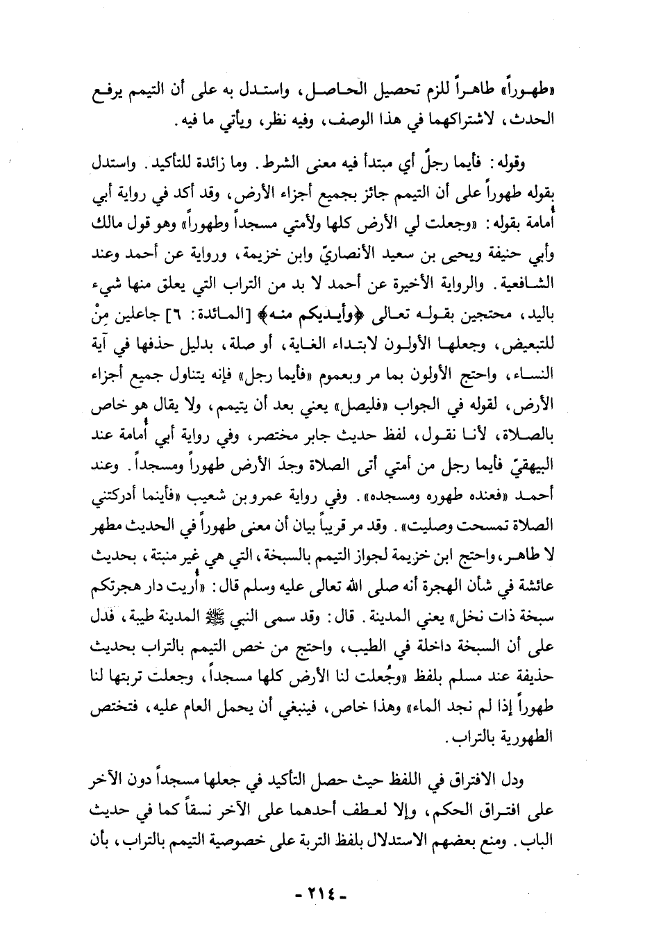 وقوله: فأيما رجلٌ أي مبتدأ فيه معنى الشرط. وما زائدة للتأكيد. واستدل بقوله طهورًا على أن التيمم جائز بجميع أجزاء الأرض، وقد أكد في رواية أبي أُمامة بقوله: "وجعلت لي الأرض كلها ولأمتي مسجدًا وطهورًا" وهو قول مالك وأبي حنيفة ويحيى بن سعيد الأنصاريّ وابن خزيمة، ورواية عن أحمد وعند الشافعية. والرواية الأخيرة عن أحمد لابد من التراب التي يعلق منها شيء باليد، محتجين بقوله تعالى {وَأَيْدِيكُمْ مِنْهُ} [المائدة: 6] جاعلين مِنْ للتبعيض، وجعلها الأولون لابتداء الغاية، أو صلة، بدليل حذفها في آية النساء، واحتج الأولون بما مرَّ وبعموم "فأيما رجل" فإنه يتناول جميع أجزاء الأرض، لقوله في الجواب "فليصل" يعني بعد أن يتيمم، ولا يقال هو خاص بالصلاة؛ لأنا نقول، لفظ حديث جابر مختصر، وفي رواية أبي أُمامة عند البيهقيّ فأيما رجل من أمتي أتى الصلاة وجدَ الأرض طهوراً ومسجدًا. وعند أحمد "فعنده طهوره ومسجده". وفي رواية عمرو بن شعيب "فأينما أدركتني الصلاة تمسحت وصليت". وقد مرَّ قريبًا بيان أن معنى طهورًا في الحديث مطهر لا طاهر، واحتج ابن خزيمة لجواز التيمم بالسبخة، التي هي غير منبتة، بحديث عائشة في شأن الهجرة أنه صلى الله تعالى عليه وسلم قال: "أُريت دار هجرتكم سبخة ذات نخل" يعني المدينة. قال: وقد سمى النبي -صلى الله عليه وسلم- المدينة طيبة، فدل على أن السبخة داخلة في الطيب، واحتج من خص التيمم بالتراب بحديث حذيفة عند مسلم بلفظ "وجُعلت لنا الأرض كلها مسجدًا، وجعلت تربتها لنا طهورًا إذا لم نجد الماء" وهذا خاص، فينبغي أن يحمل العام عليه، فتختص الطهورية بالتراب.